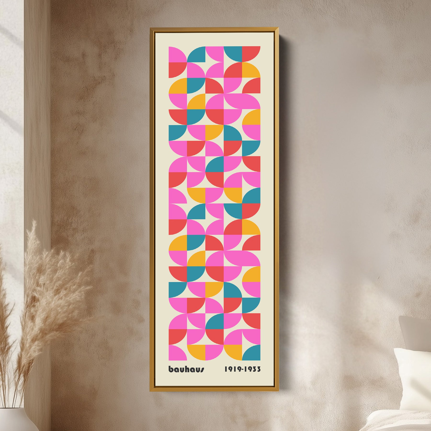 Ideal for tall narrow wall art, this piece adds a striking and artistic touch to vertical spaces such as hallways, bedrooms, or office corners. As Bauhaus mid-century modern framed canvas wall decor, it serves as a bold focal point, seamlessly blending with retro, industrial, or minimalist interiors. The combination of geometric precision and a refined color palette makes this artwork a stylish and versatile addition to any space, perfect for those who appreciate modernist design with a contemporary edge.