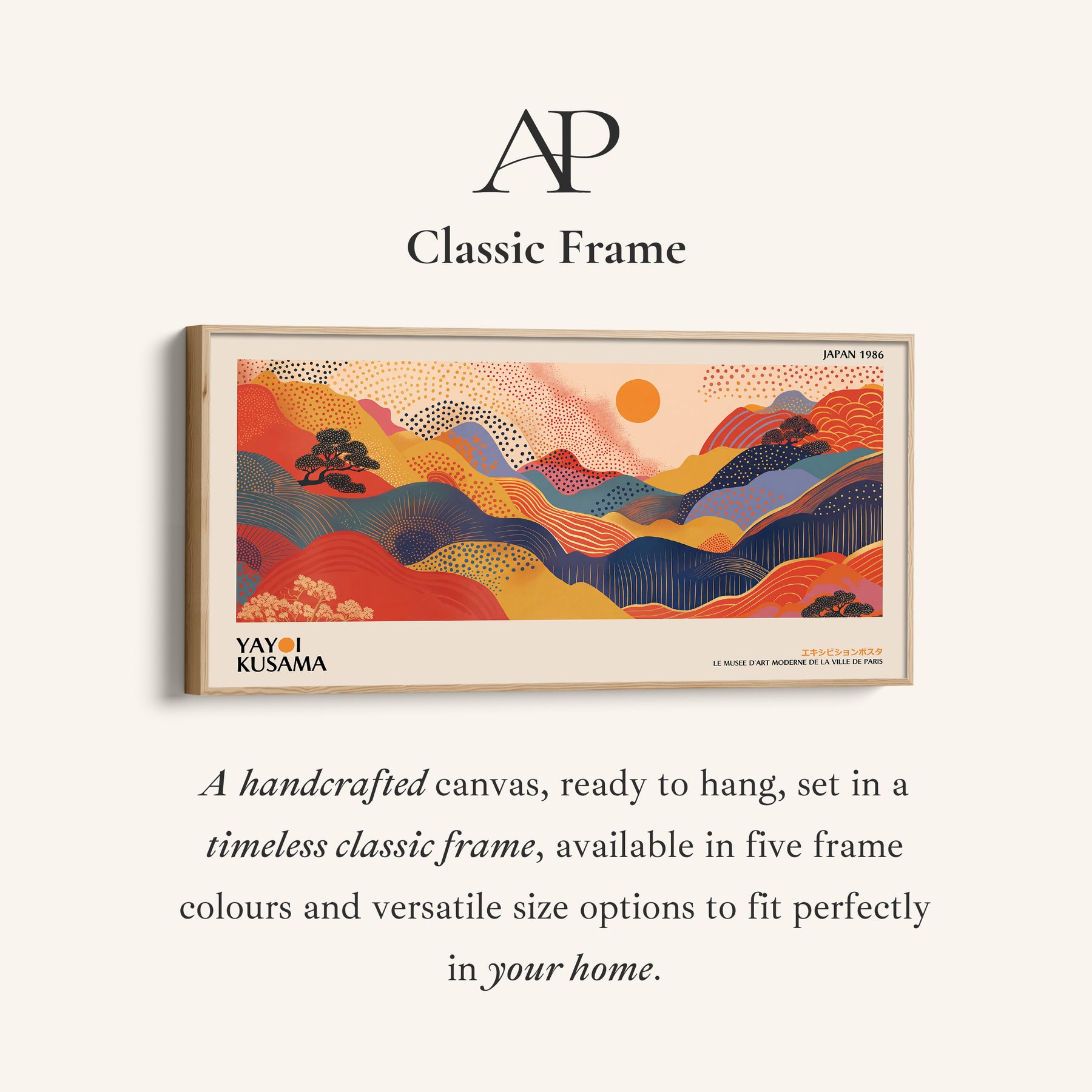 Yayoi Kusama wide framed canvas featuring abstract rolling hills in orange, yellow and blue with a circular sun above. Layered dotted patterns sweep across the horizontal landscape. Orange and yellow hills contrast with blue sections, forming a panoramic wall art arrangement that moves fluidly from side to side. The circular sun anchors the upper area. As large wall art in a living room, this extended layout energises the space through bold colour and structured repetition.