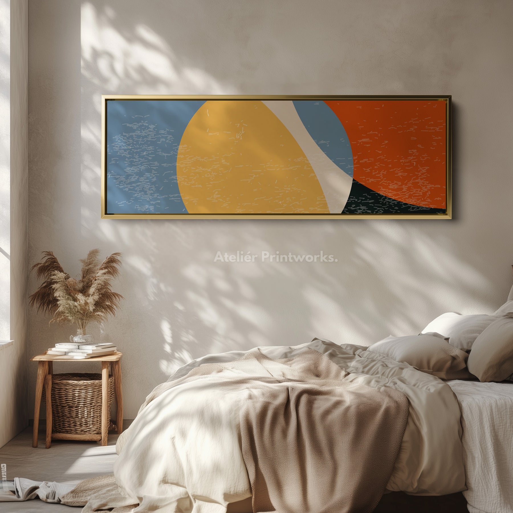 Large overlapping curved shapes in yellow, orange and blue form a bold yet soft abstract composition. The texture adds character and warmth. Ideal as above bed wall art, giving structure and colour while remaining calm and modern. Perfect for cosy bedrooms or stylish living rooms needing an uplifting focal point.