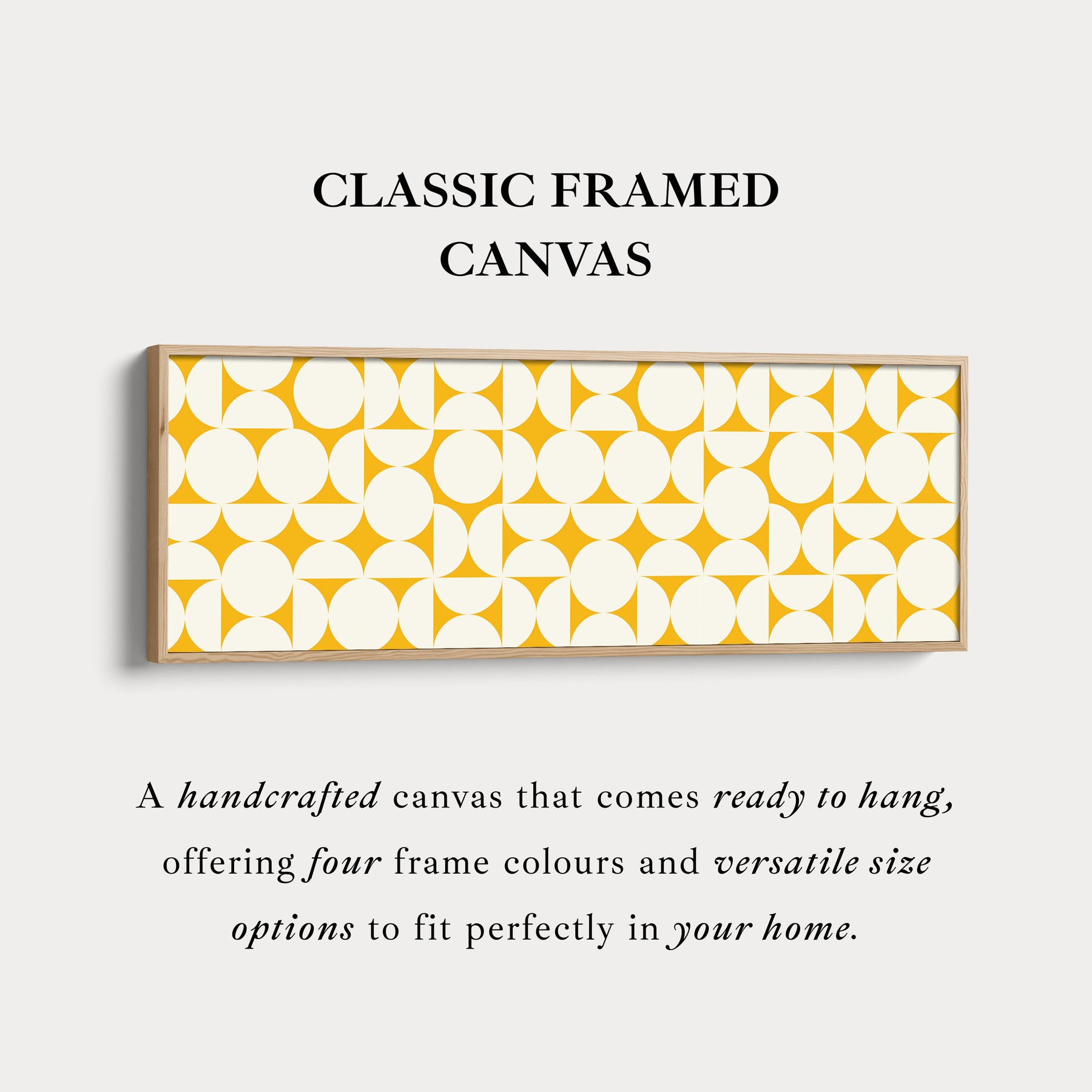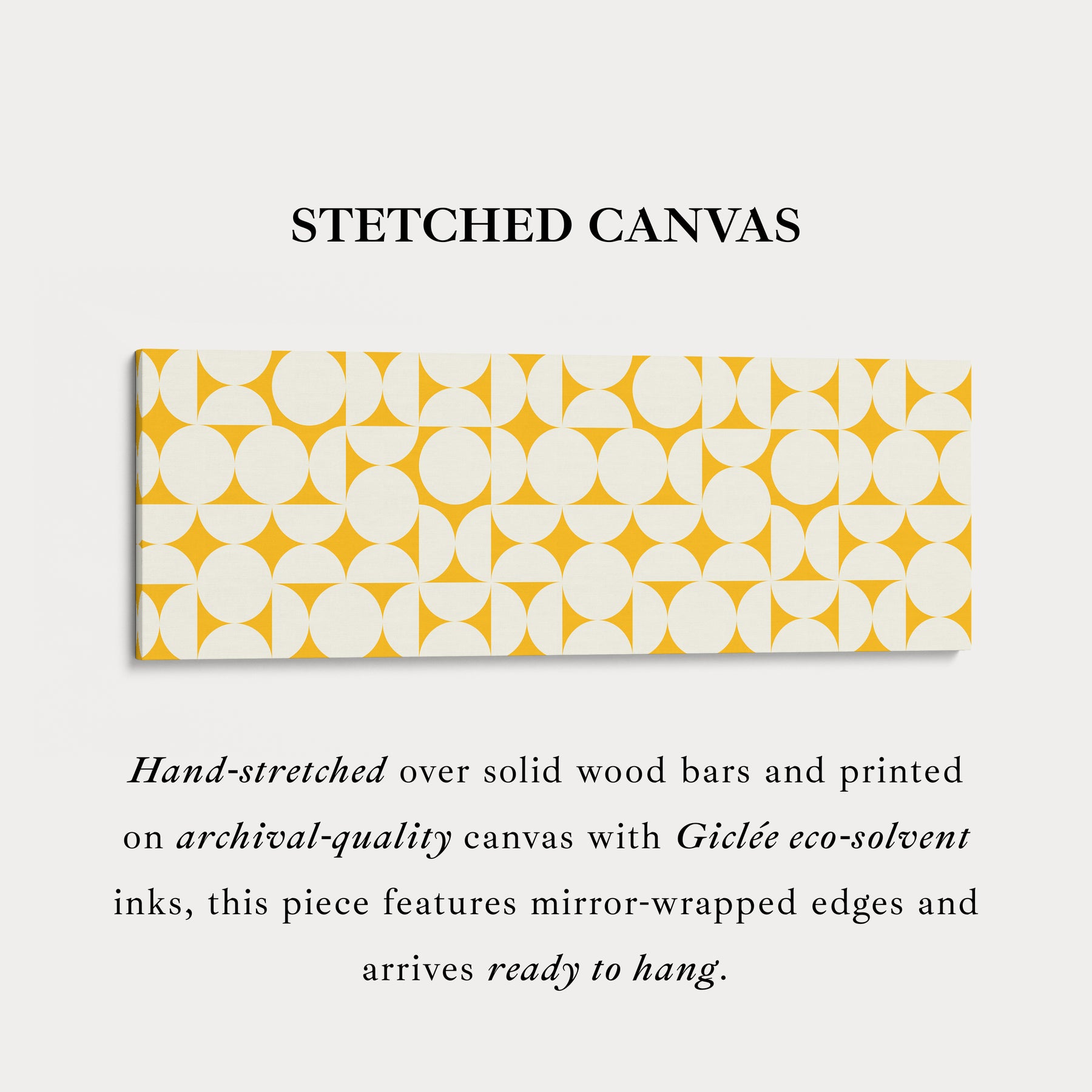 A repeating geometric pattern in yellow and beige brings playful symmetry and mid‑century character. This panoramic wall art suits interiors looking for warmth and pattern without clutter. Excellent above a sofa, in dining rooms, or bright modern kitchens.