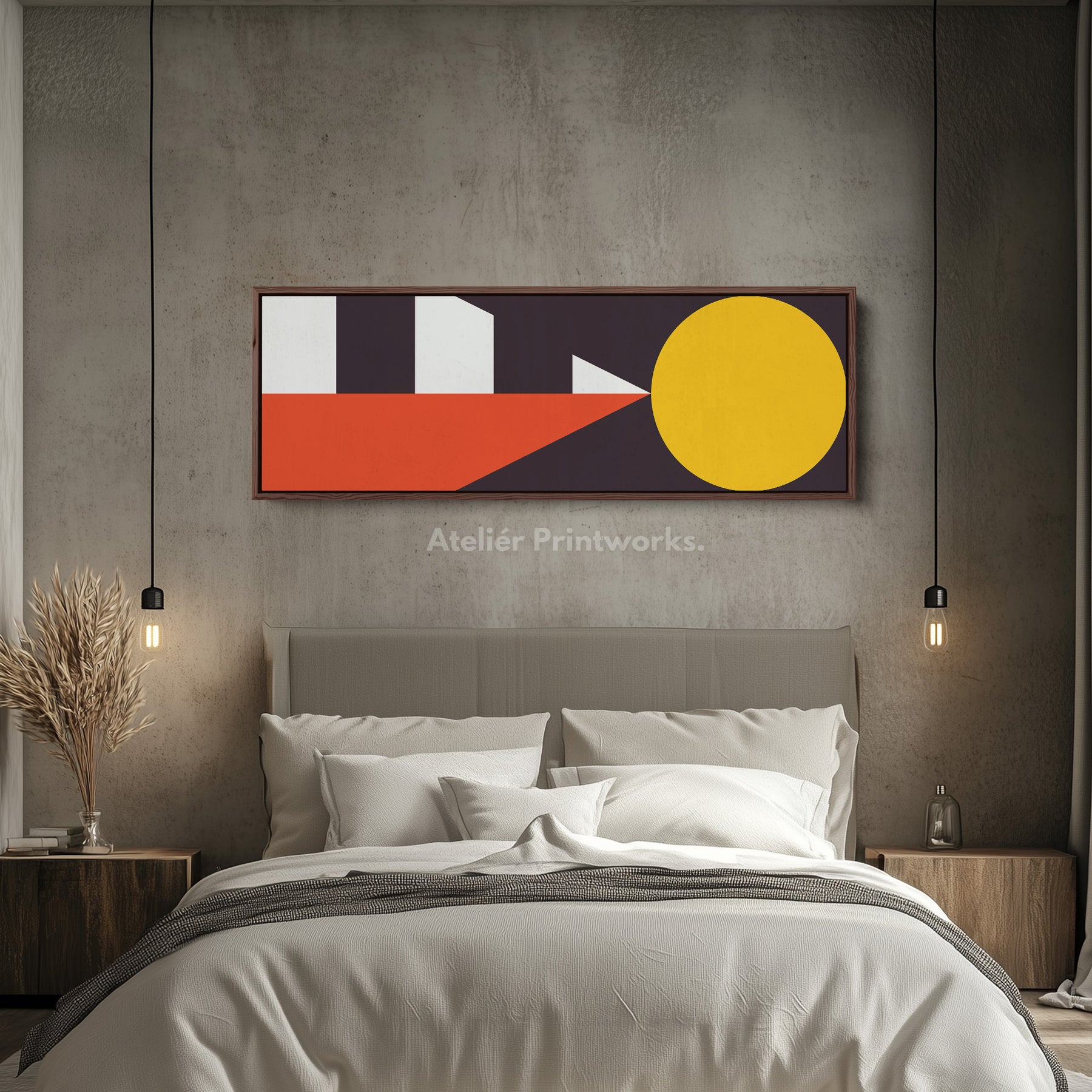 Warm yellow and deep orange intersect with minimal white and black, creating a modern geometric composition that feels structured yet bold. This panoramic wall art stretches horizontally, making it ideal for long walls. Placed as above bed wall art or above a sofa, the wide canvas introduces energy without overwhelming the room. The strong linear geometry gives a sense of direction and movement. Perfect for living rooms, hallways or stylish workspaces that benefit from modern colour design.