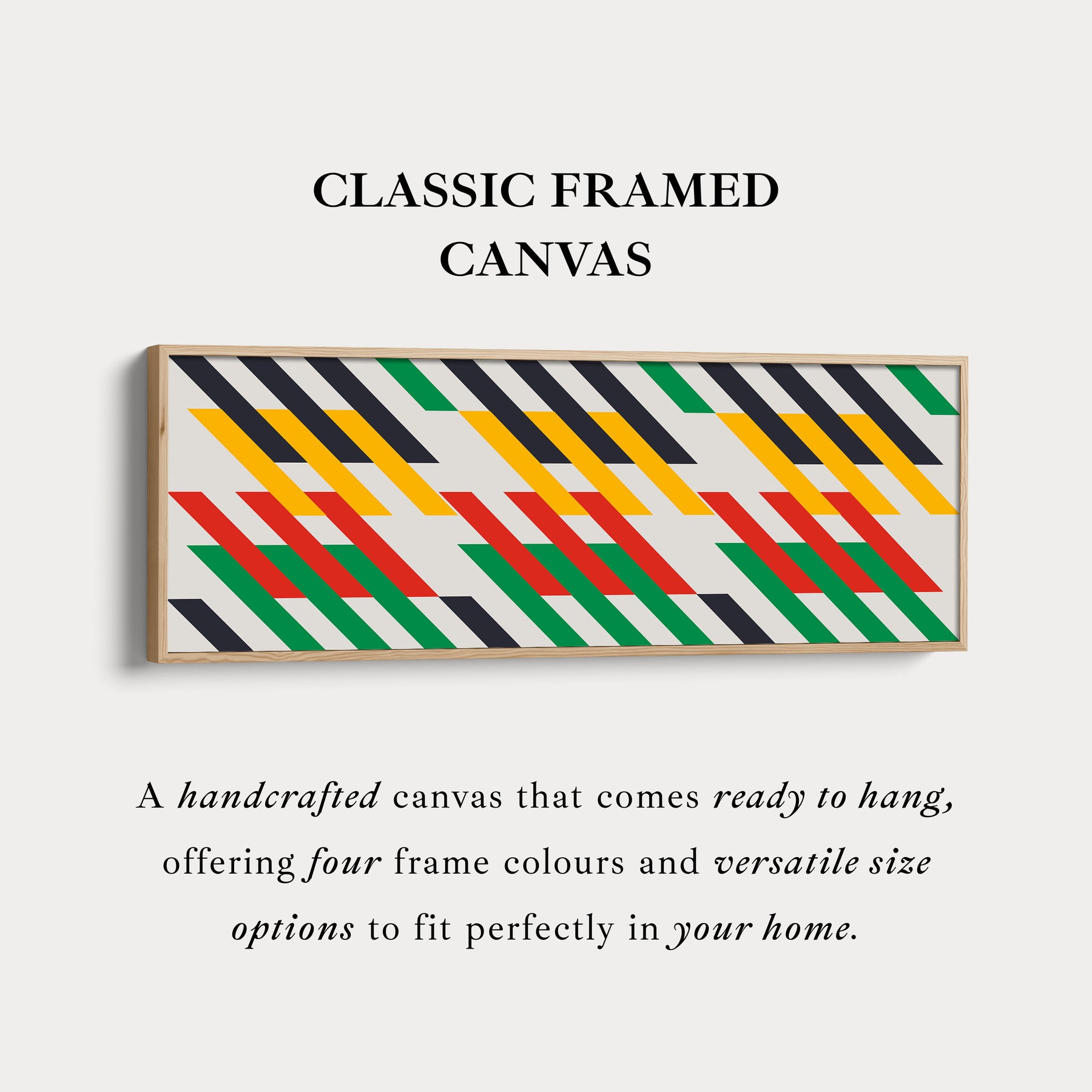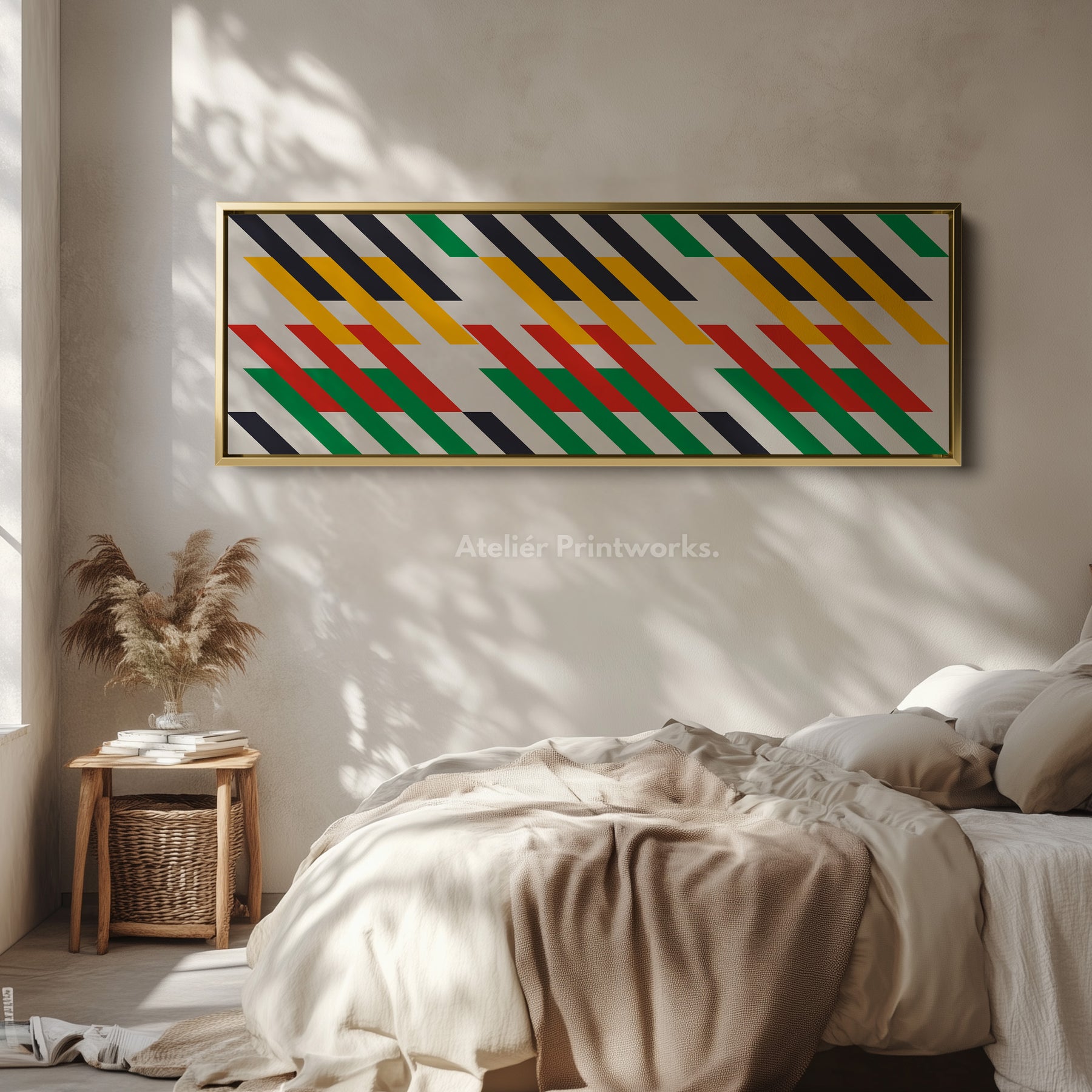 This horizontal wall art features repeating diagonal geometric stripes in bold yellow, red and green across a clean light background. The wide layout makes this long canvas ideal for large horizontal wall spaces. As above bed wall art it brings structure, energy and modern rhythm without clutter. The strong repetition makes it a striking focal point in contemporary interiors. Perfect for living rooms, hallways or creative workspaces looking for colour and movement.