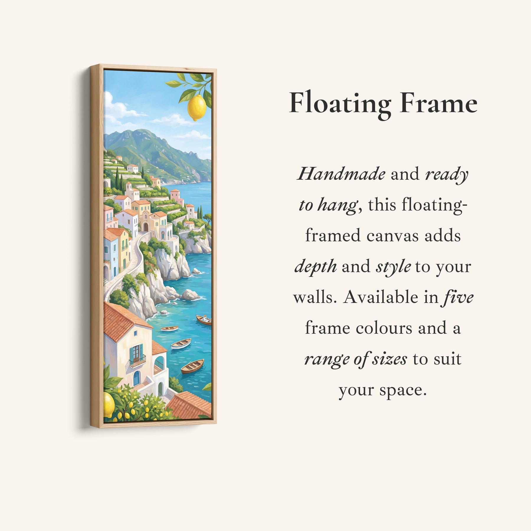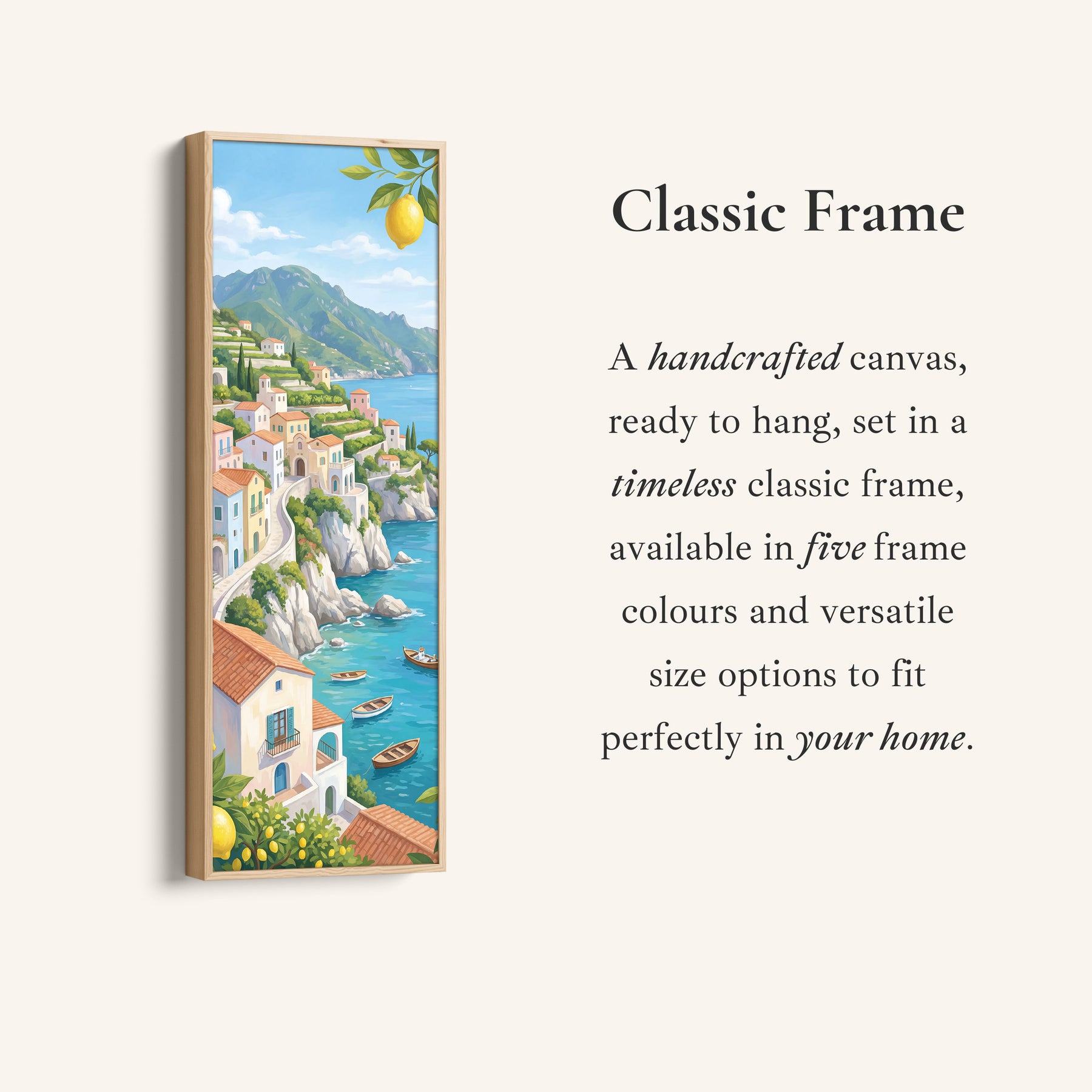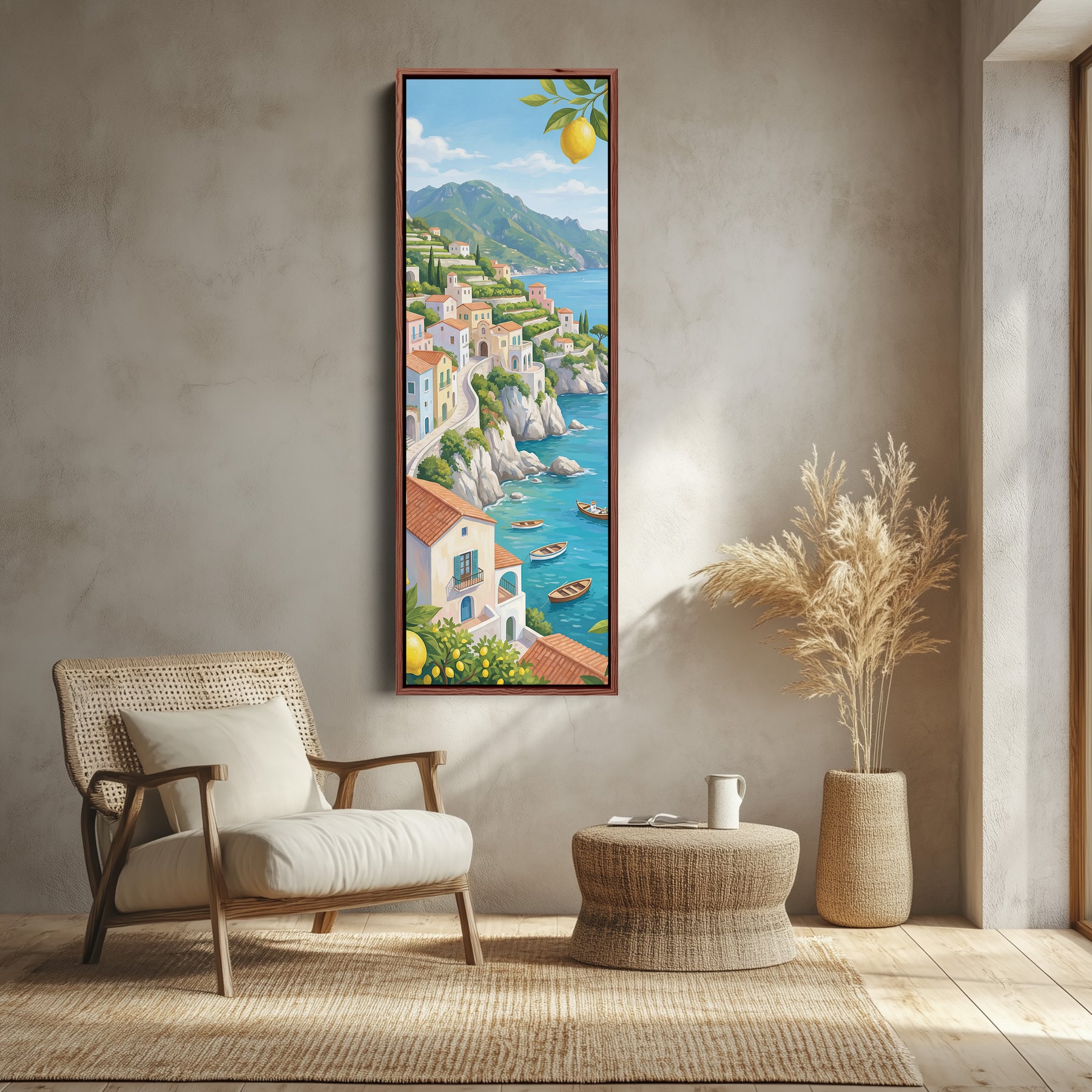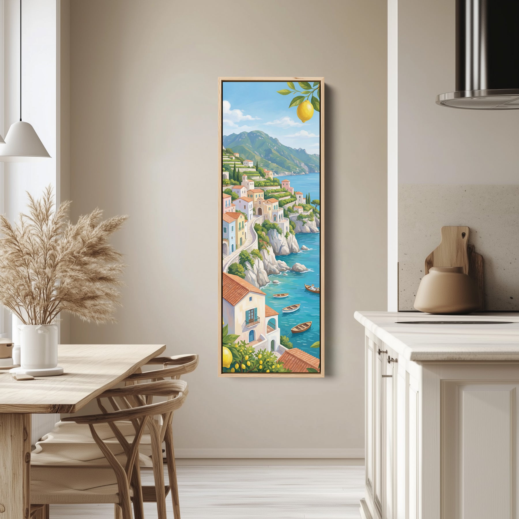 Pastel houses sit along green cliffs above blue sea with bright yellow lemons hanging in the foreground. Small boats float near the rocky shoreline. This Vertical wall art blends blue water and green hills with yellow accents from the lemons above. The layered coastal setting creates depth and movement. As large wall art for a kitchen, it brings vibrant colour and Mediterranean character while maintaining a balanced scenic composition.