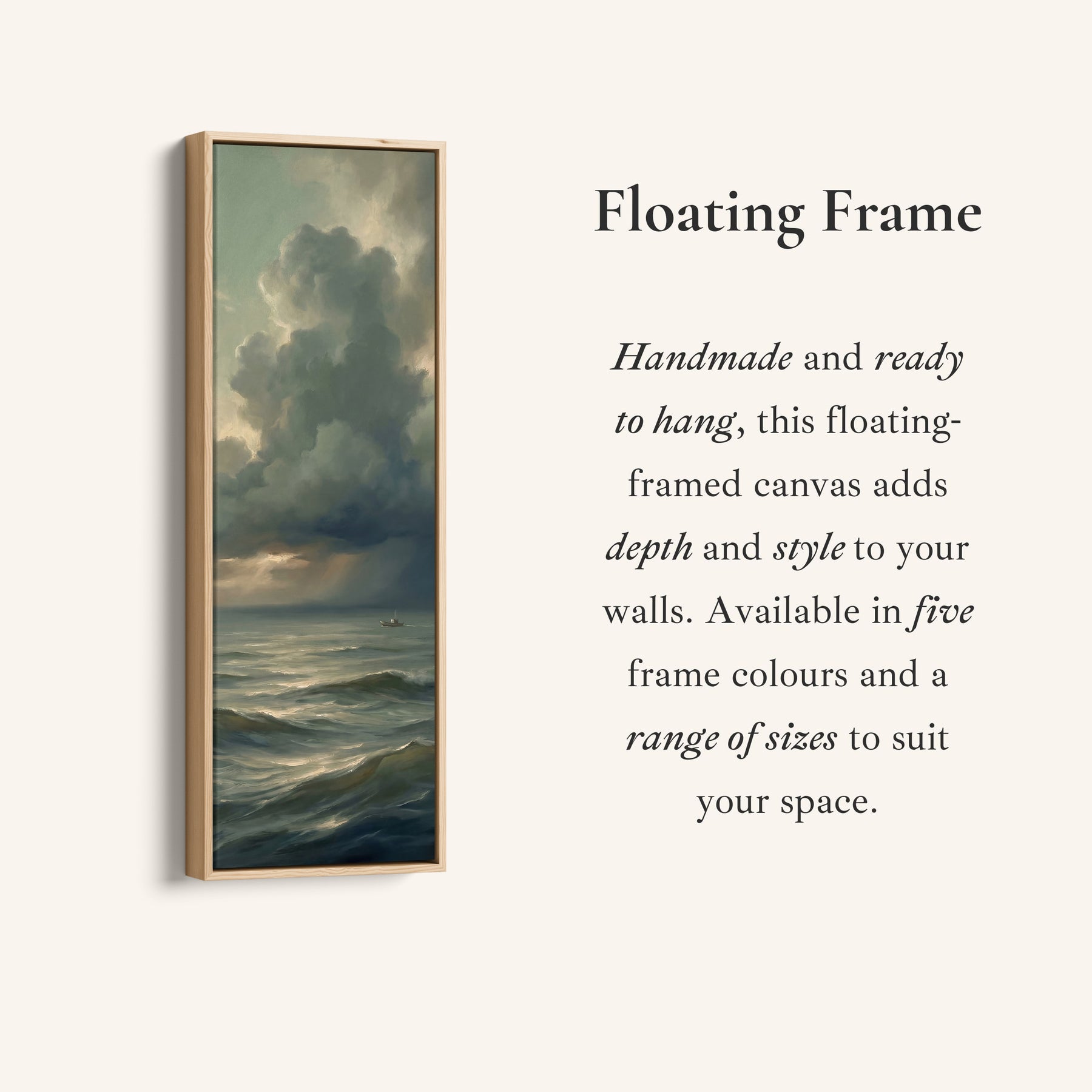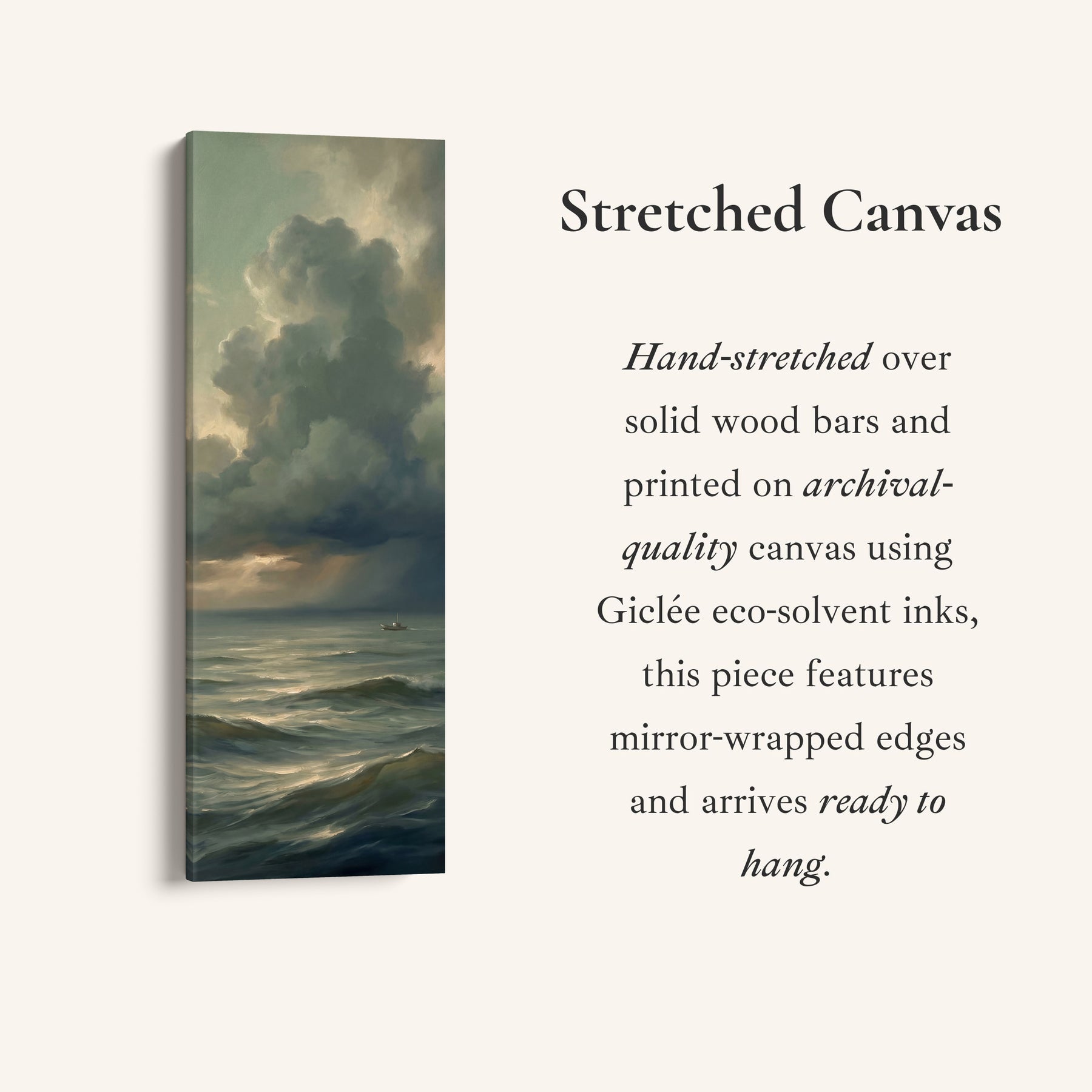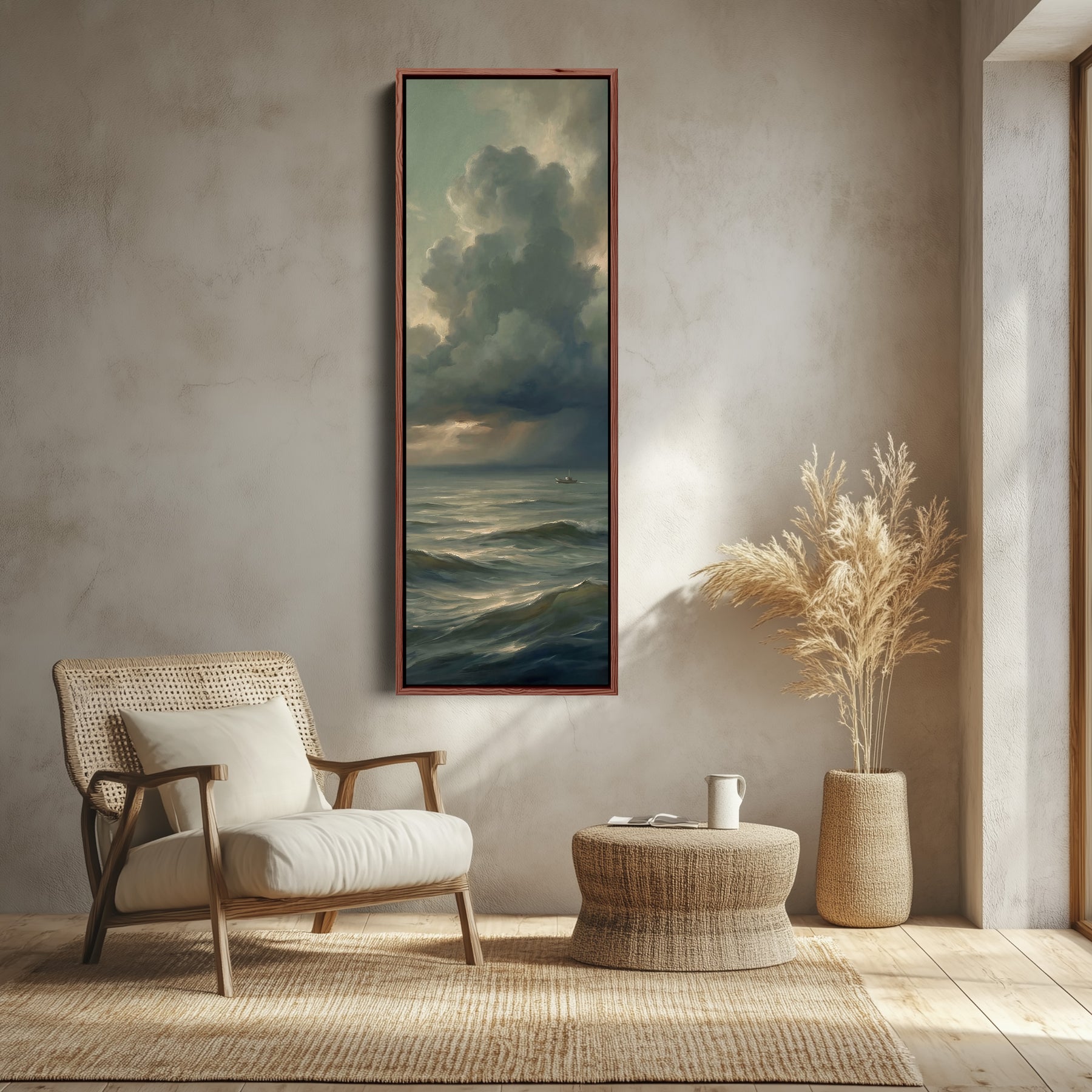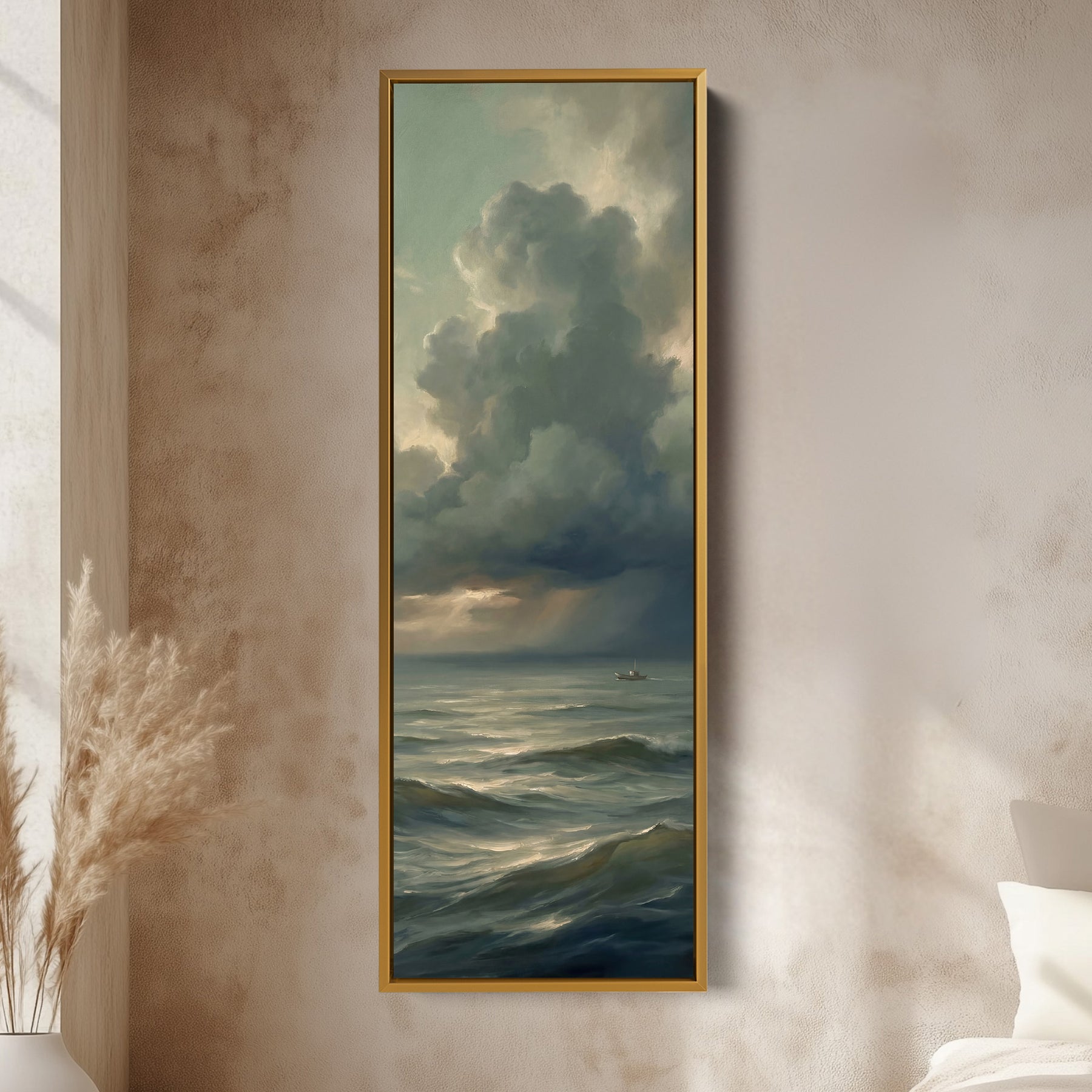 Large grey clouds tower above green ocean waves with a small boat visible in the distance. The sky dominates the upper portion of the scene. This wide framed canvas captures dramatic cloud formations over shifting water. Grey and green tones create depth and movement across the composition. Ideal for an office, this Vertical wall art delivers strong presence while maintaining natural colour harmony.