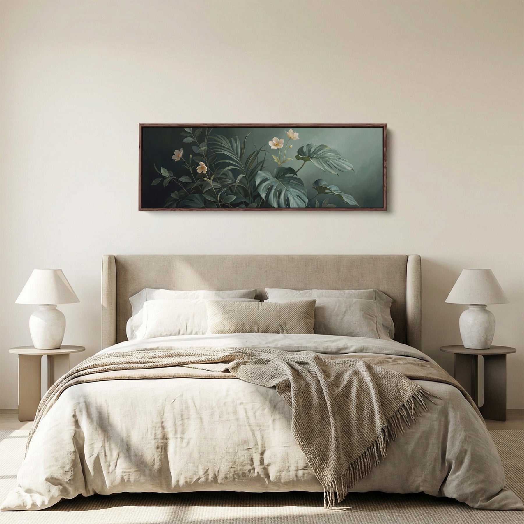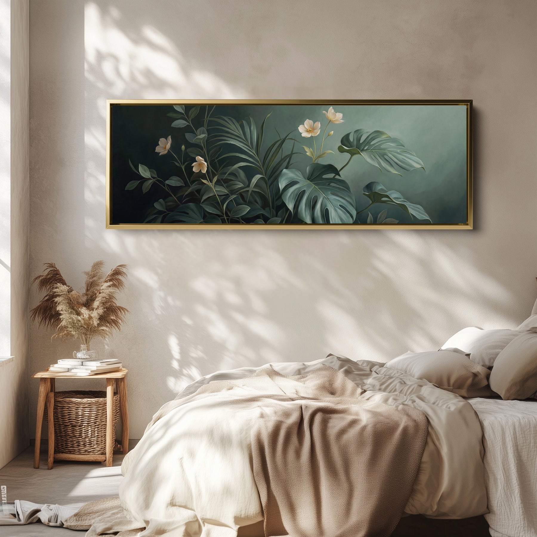 Large green tropical leaves and white flowers appear against a black background. The foliage spreads across the full horizontal composition. Green and white tones contrast strongly with the dark backdrop, creating bold botanical depth. The wide layout enhances the layered leaves across the frame. This horizontal wall art works beautifully in a bedroom, offering wide wall art scale with strong natural presence and balanced composition.