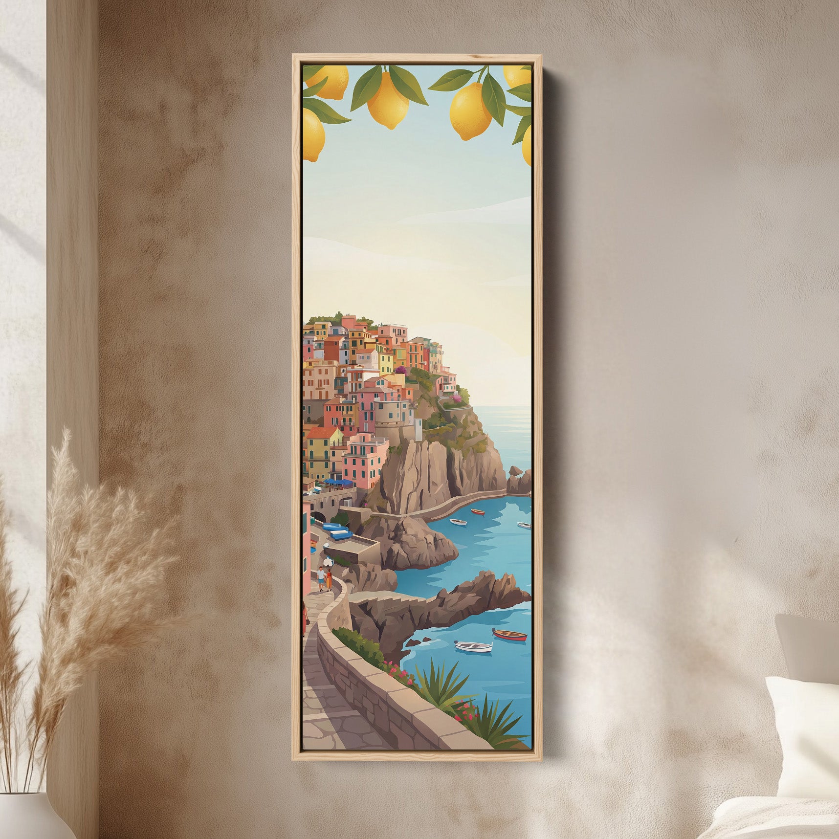 Pastel houses sit along a cliff above blue sea with yellow lemons hanging in the foreground. Small boats float near the rocky shoreline beneath a soft sky. This vertical wall art highlights layered coastal architecture framed by bright yellow fruit and calm blue water. The tall composition emphasises the height of the cliffside village. Ideal for a kitchen, this tall canvas print introduces fresh Mediterranean colour and structured seaside detail.