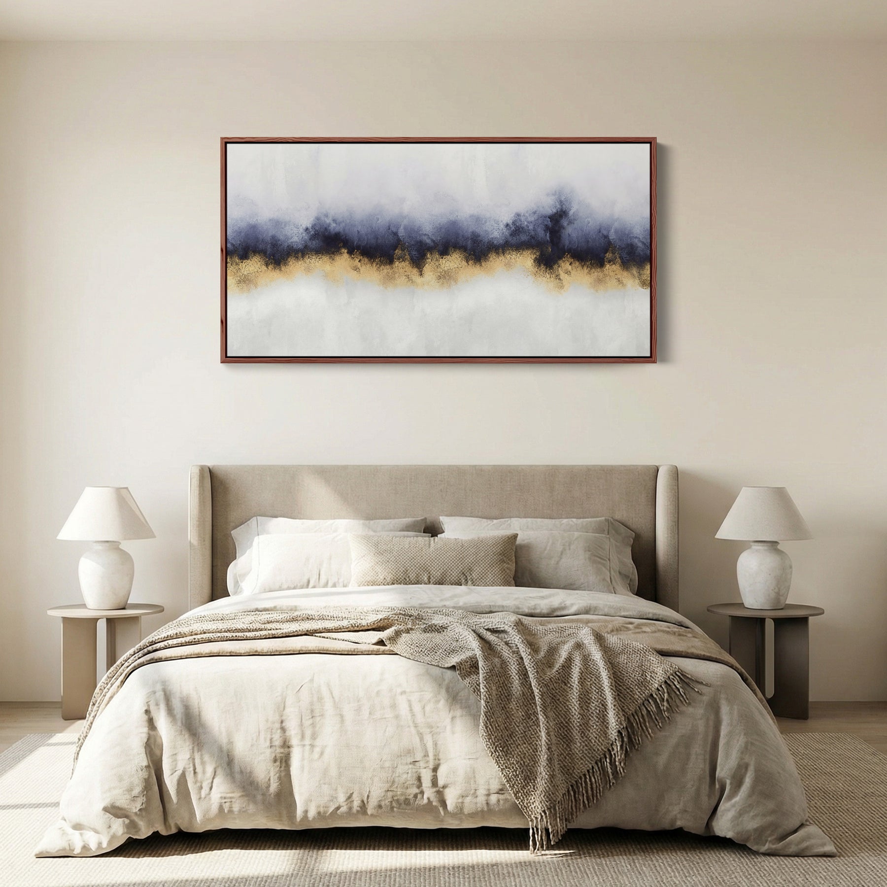 A dark blue horizontal band cuts across a white and beige background, separated by a striking gold strip. The contrast between the deep band and lighter backdrop creates a bold linear composition. Designed as above sofa wall art, this horizontal canvas print introduces clean structure and refined colour blocking to an office setting. The wide format emphasises the strong central line. This wide wall art piece suits modern interiors seeking large wall art with confident simplicity and a clear visual focal point.