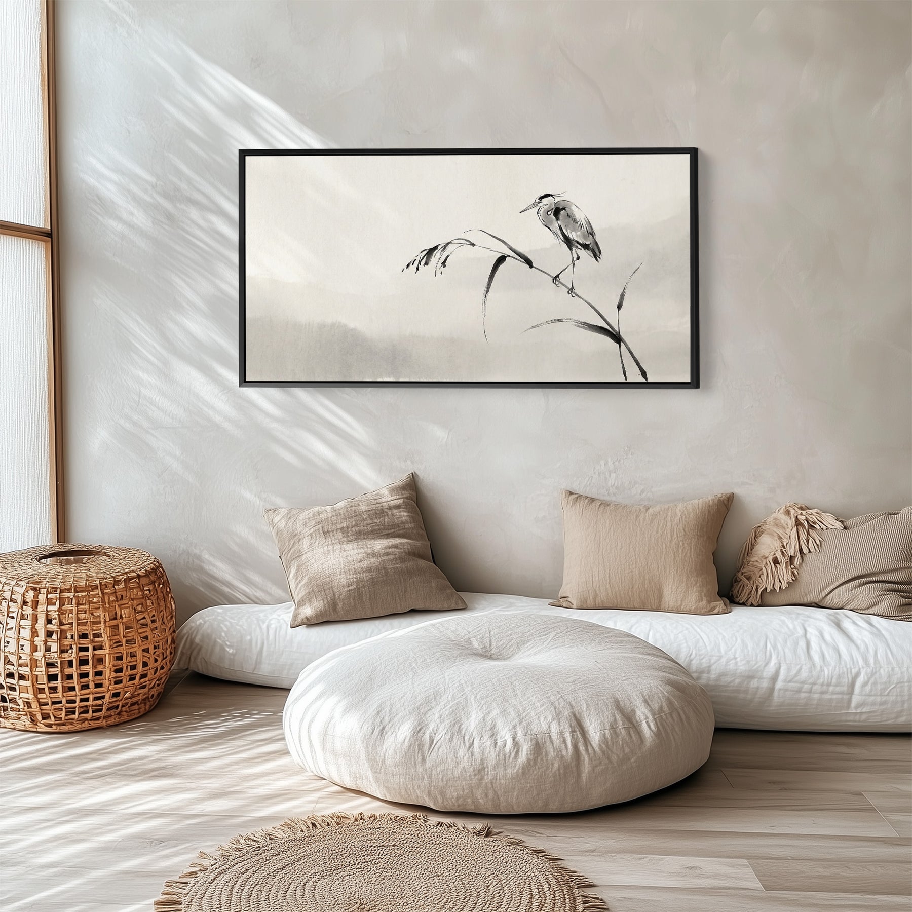 A black and grey ink style heron stands on a thin branch against a soft white background. The minimal contrast between white, grey and black creates a calm balanced composition. This horizontal wall art brings a quiet natural presence to a bedroom, with the simple silhouette and open space allowing the subject to breathe. The restrained colour palette keeps the look clean and refined. Ideal for those seeking wide wall art with a subtle nature theme, this piece works beautifully as horizontal wall art above a bed or along a neutral wall where simplicity is key.