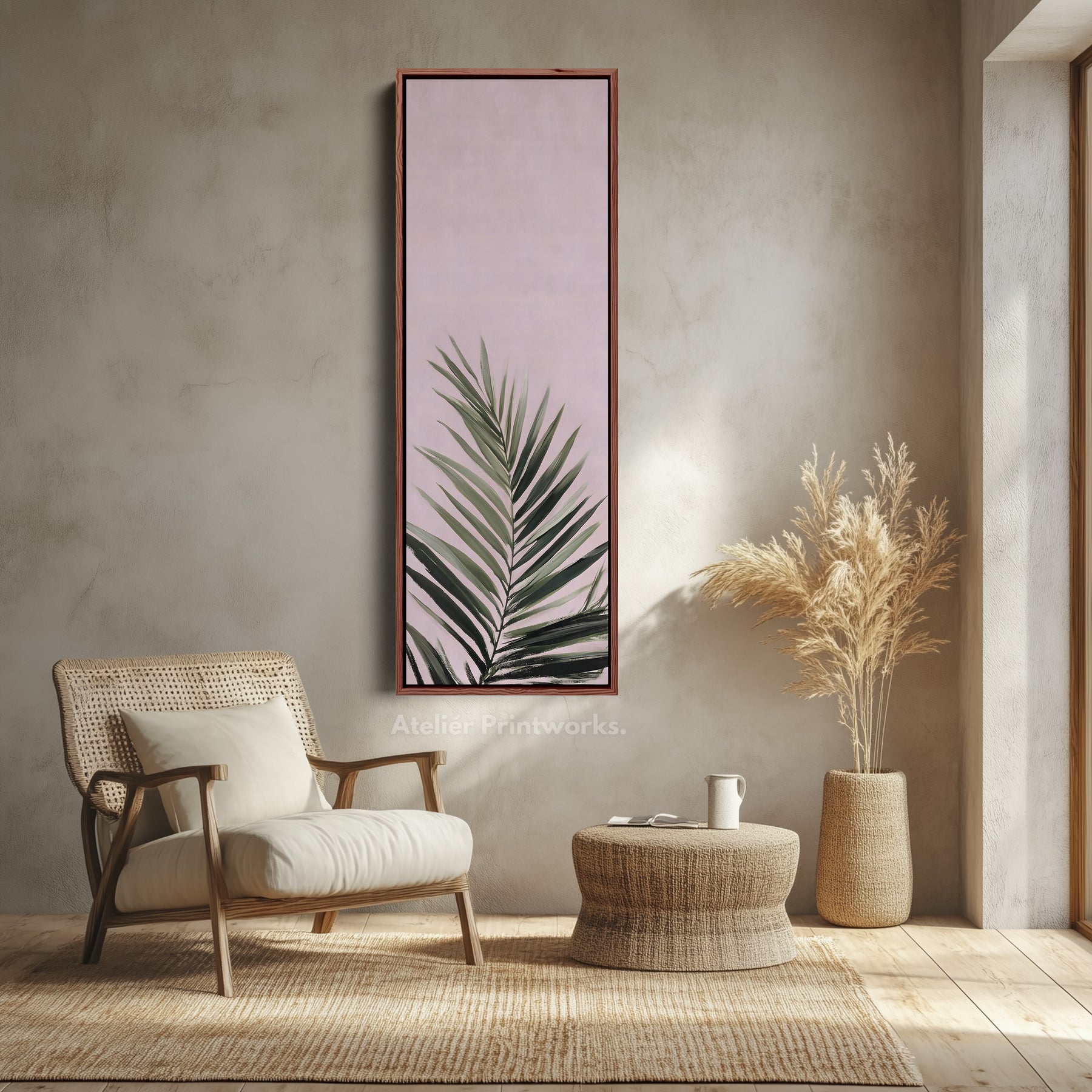 Soft pink leaves fade into a light background bringing a calm soothing feel. The tall wall art adds height and elegance. This long vertical canvas works well in narrow areas where skinny wall art enhances balance. The minimal palette keeps the room feeling airy. Ideal for bedrooms or dressing rooms where above console wall art brings subtle character.