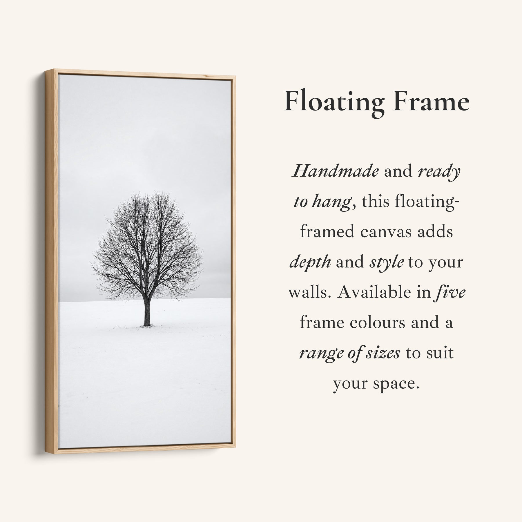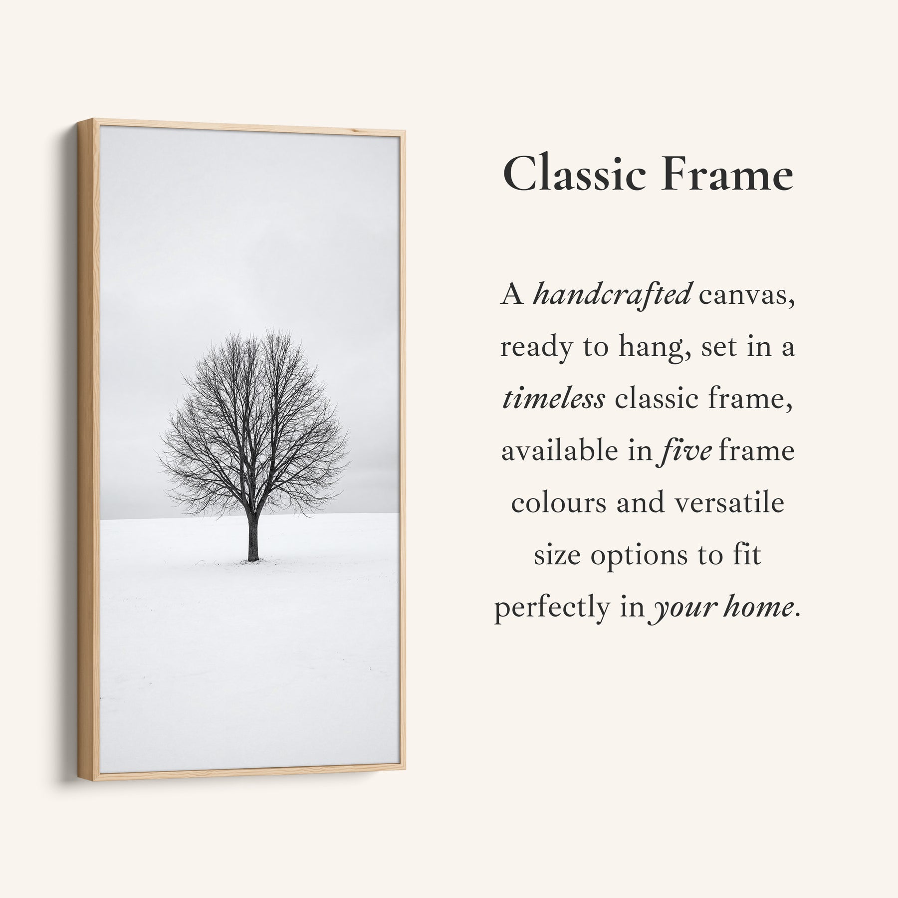 A bare tree stands alone in a snowy field under a pale sky. The visible colours stay within white and grey. This vertical wall art suits walls that need height and balance, keeping the layout calm and proportion-led. Use it as a large vertical wall art in a kitchen to add scale without taking up extra width.