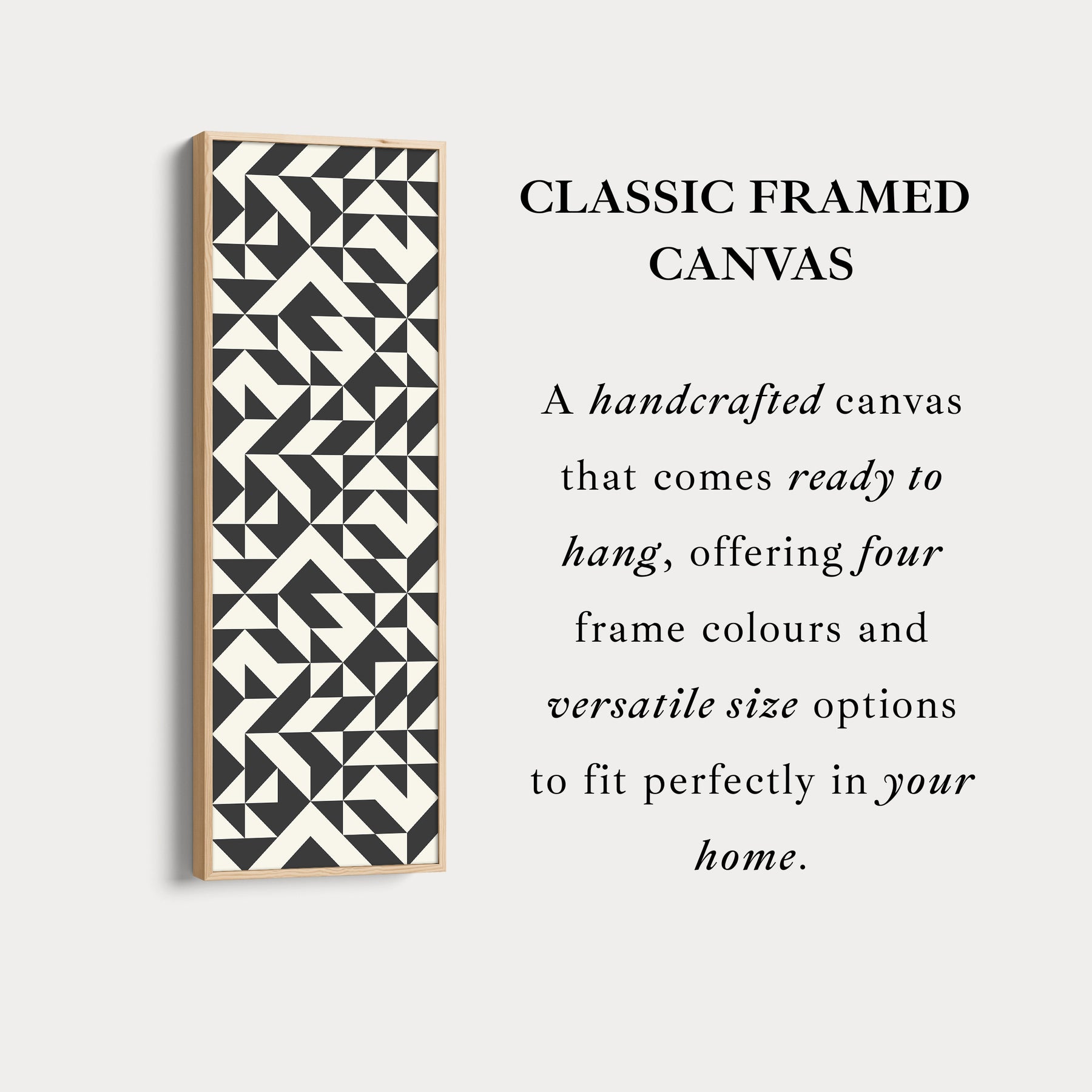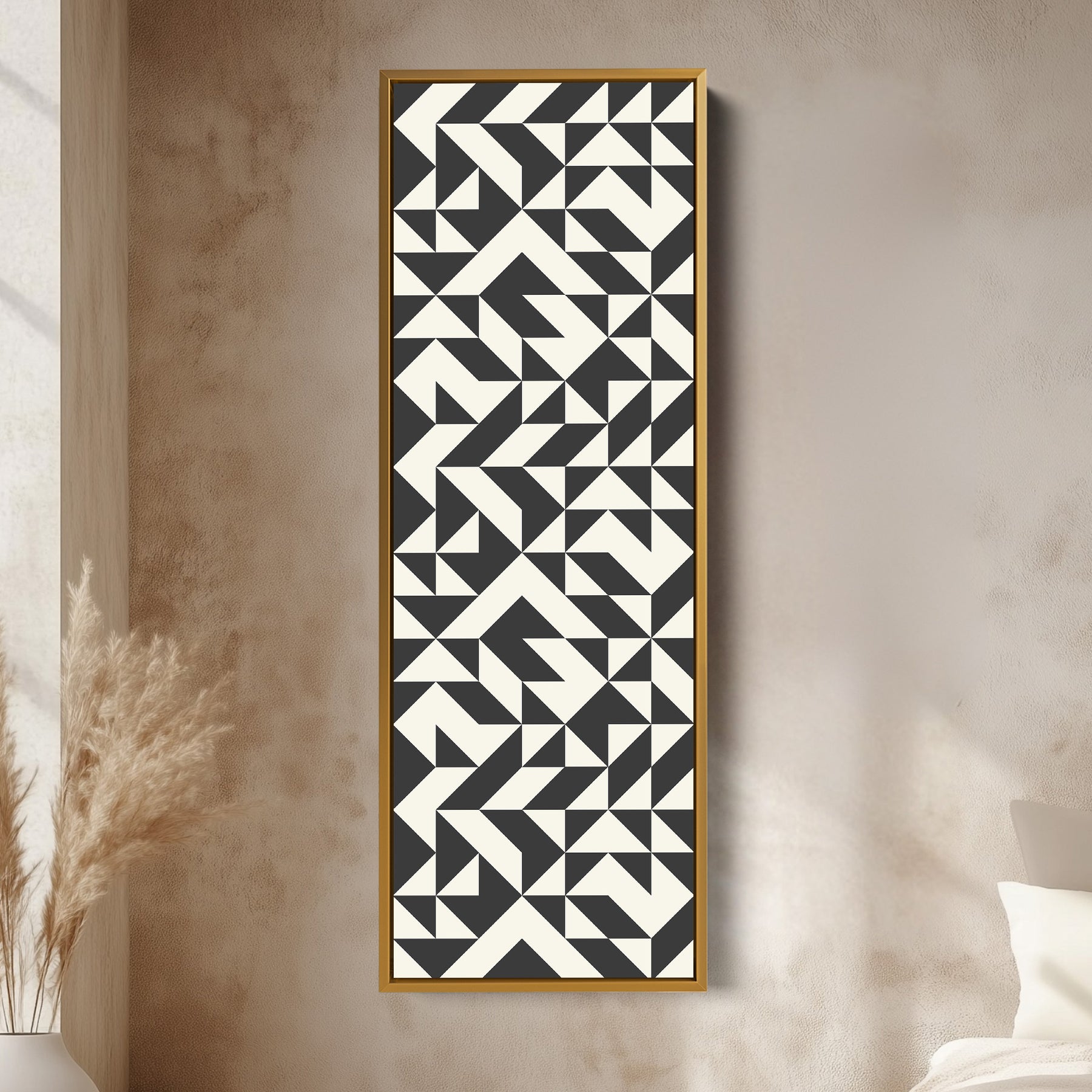 This bold geometric artwork showcases a repeating pattern of black and cream angular shapes, forming dynamic arrow-like designs. The structured composition creates a sense of rhythm and movement, making it both modern and timeless. Perfect as vertical framed canvas wall art for living rooms, hallways, or offices, this piece adds bold character to narrow wall spaces.