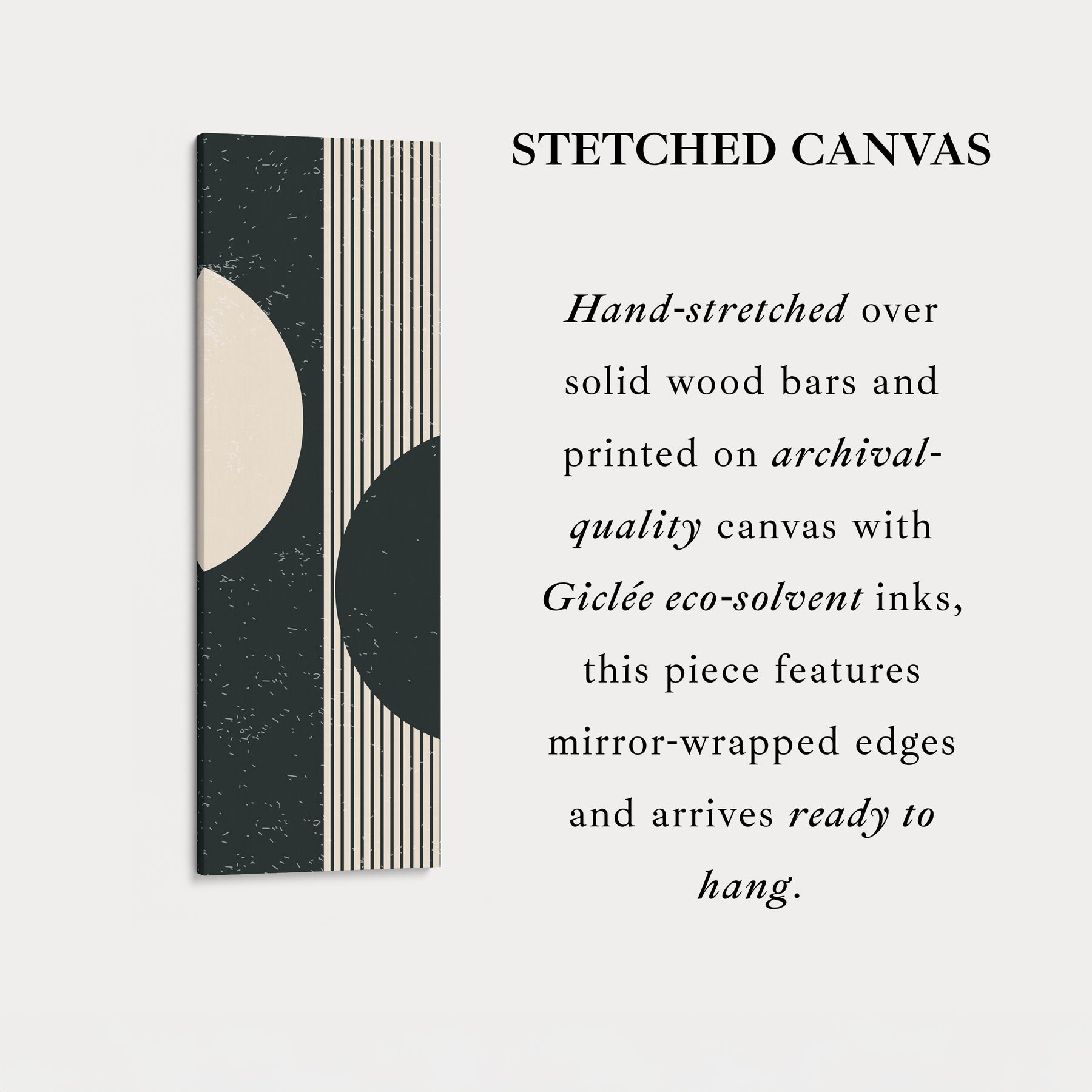 This abstract framed canvas features a bold half-and-half circle design in beige and black with striped detailing. The distressed texture adds depth and character. Perfect for hallways, offices, or modern living spaces, this vertical wall art brings structure and contrast.
