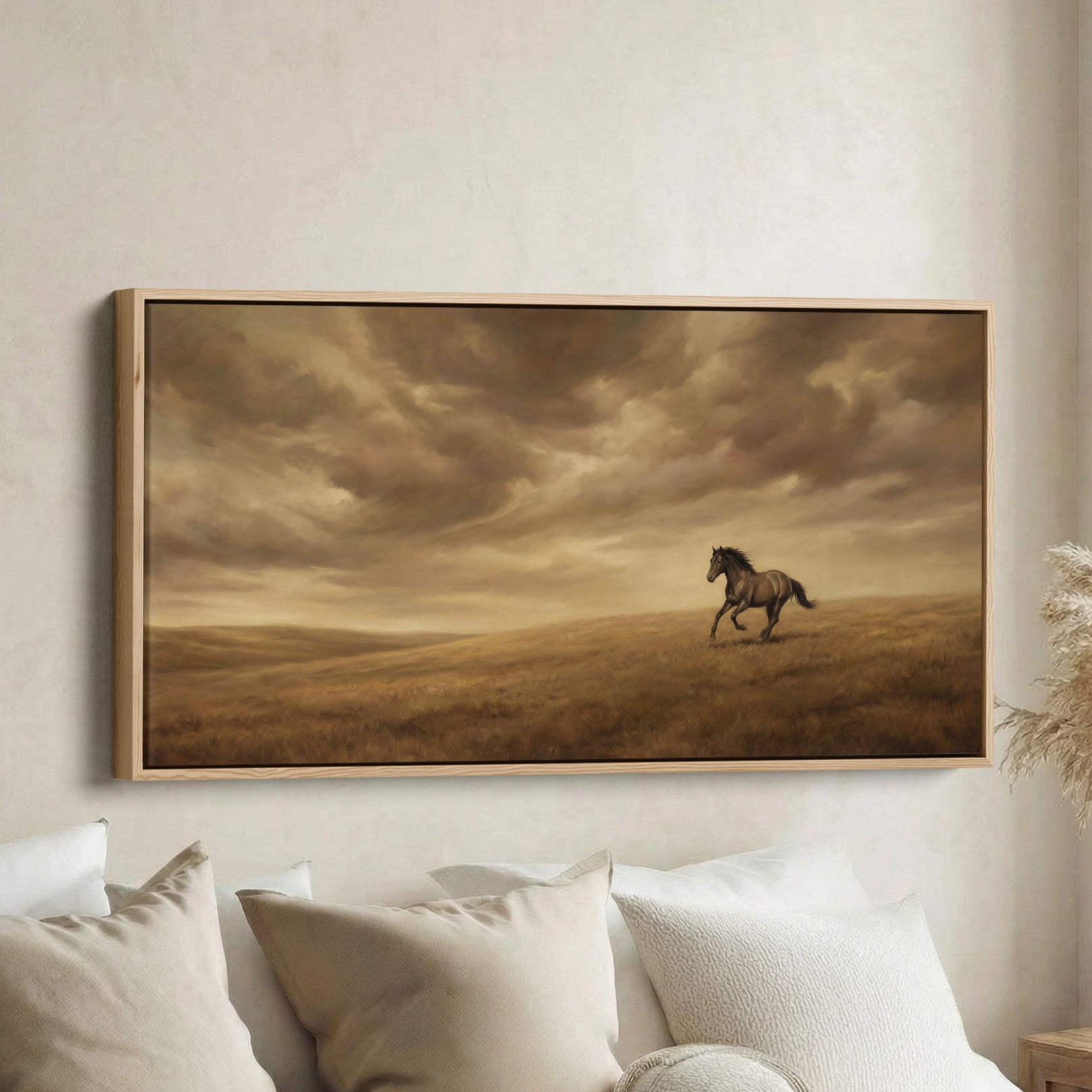A brown horse runs across an open field beneath a wide beige and grey sky filled with layered clouds. The motion of the horse against the expansive horizon gives this large wall art a powerful yet refined presence. Brown tones of the field blend with the soft beige sky, creating depth across the horizontal format. Displayed in a hallway, this statement wall decor introduces energy and movement while maintaining a cohesive natural palette.