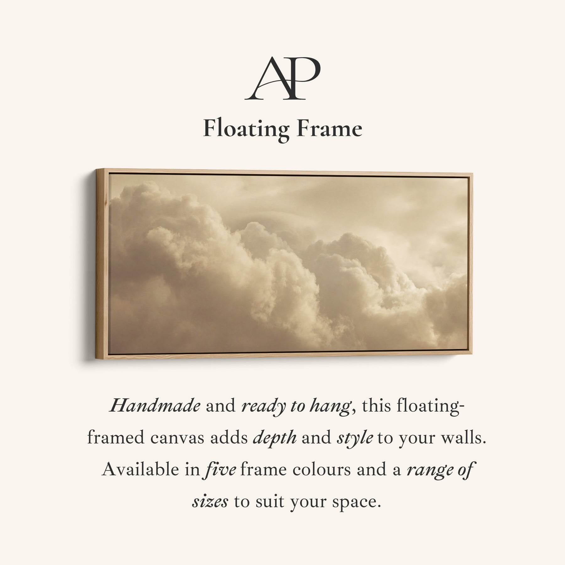 Thick warm toned clouds fill the sky in soft beige and white hues. Gentle grey shadows add depth across the cloud forms. This horizontal wall art highlights the softness of layered clouds, making it a welcoming addition to a living room. The beige and white palette introduces warmth while remaining neutral. As large wall art, it spans wide walls comfortably, offering a calm atmospheric scene that complements relaxed interiors.