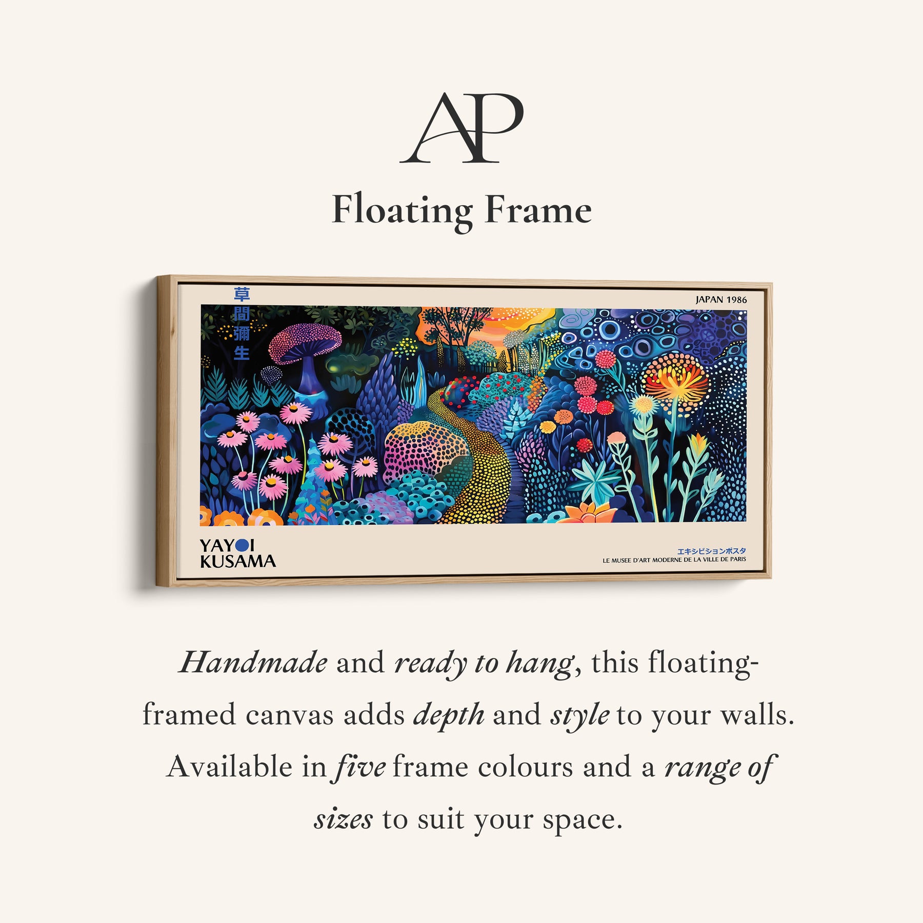 Yayoi Kusama large wall art illustrating a night garden with a winding dotted path in blue, green and pink. Dense plant forms and rounded shapes fill the horizontal layout. Blue and green tones dominate the background while pink flowers add contrast across the panoramic composition. The dotted path curves through the centre, guiding the eye. In a hallway, this wide wall art format extends the visual depth of the space while maintaining a vivid structured arrangement.