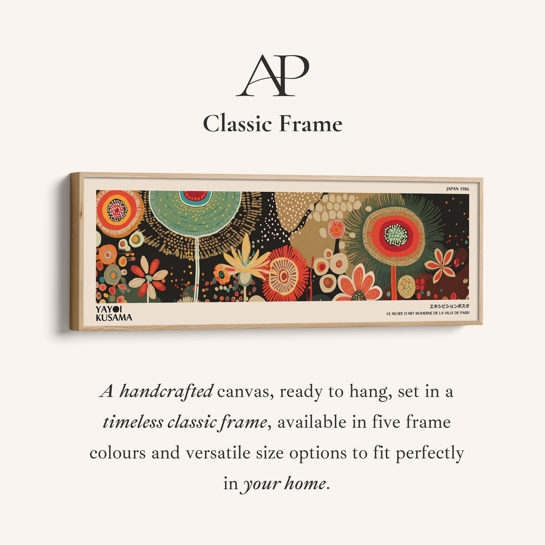 Yayoi Kusama features large circular floral forms in red and beige surrounded by green and dotted accents. The oversized rounded shapes stretch across the wide horizontal space. This wide wall art focuses on bold circular repetition arranged across a long wall art format. Red and beige dominate the palette while green shapes provide contrast. Suitable for a bedroom, this panoramic wall art introduces structured floral rhythm across extended walls.