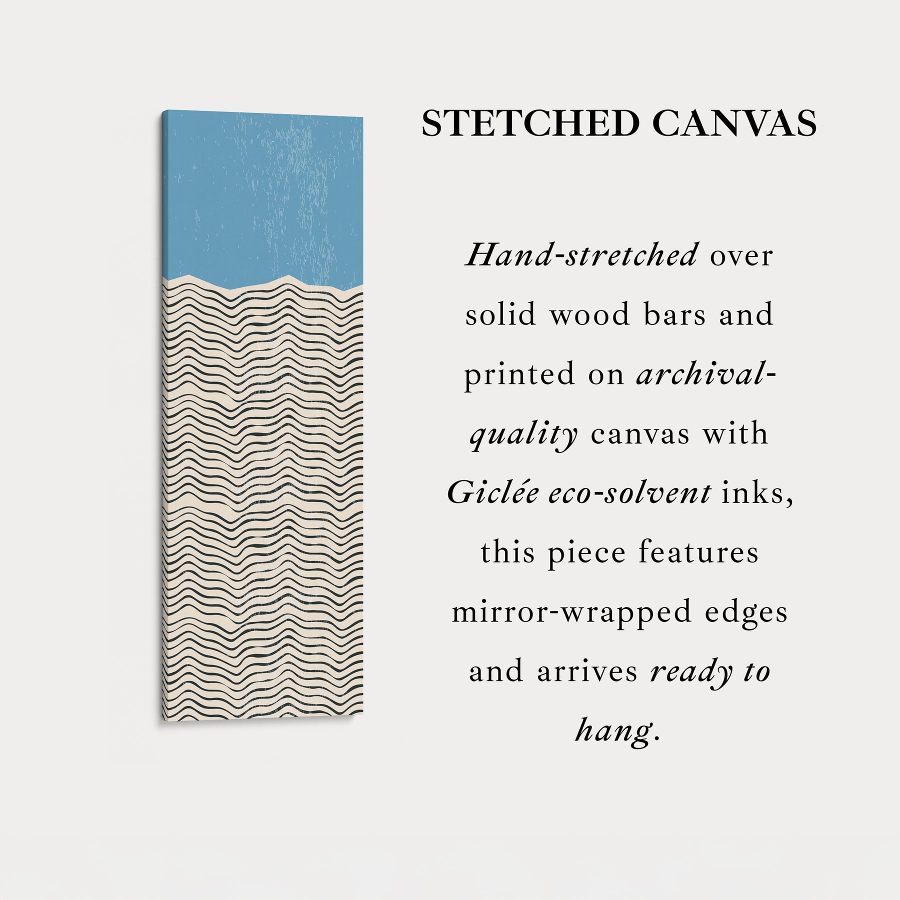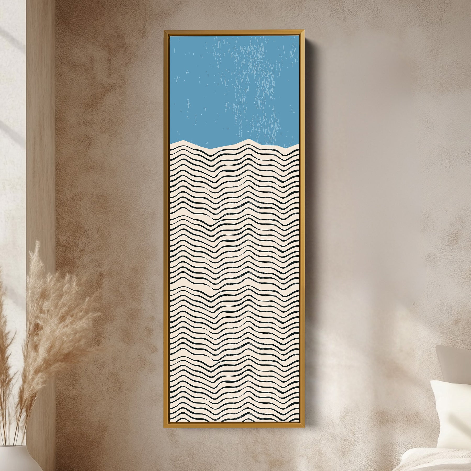 This modern abstract framed canvas features black wave lines flowing beneath a bold golden yellow block. The textured background adds depth, while the vertical format highlights movement and balance. Perfect for hallways, bedrooms, or minimalist interiors, this vertical wall art brings warmth and harmony to narrow spaces.