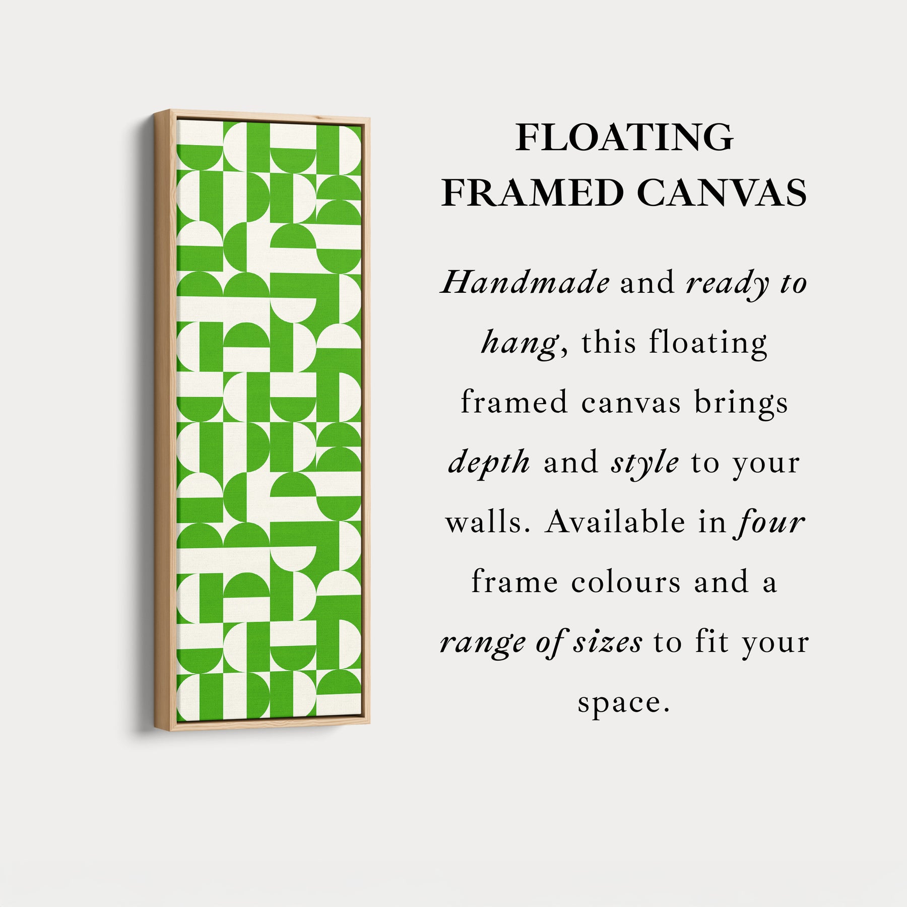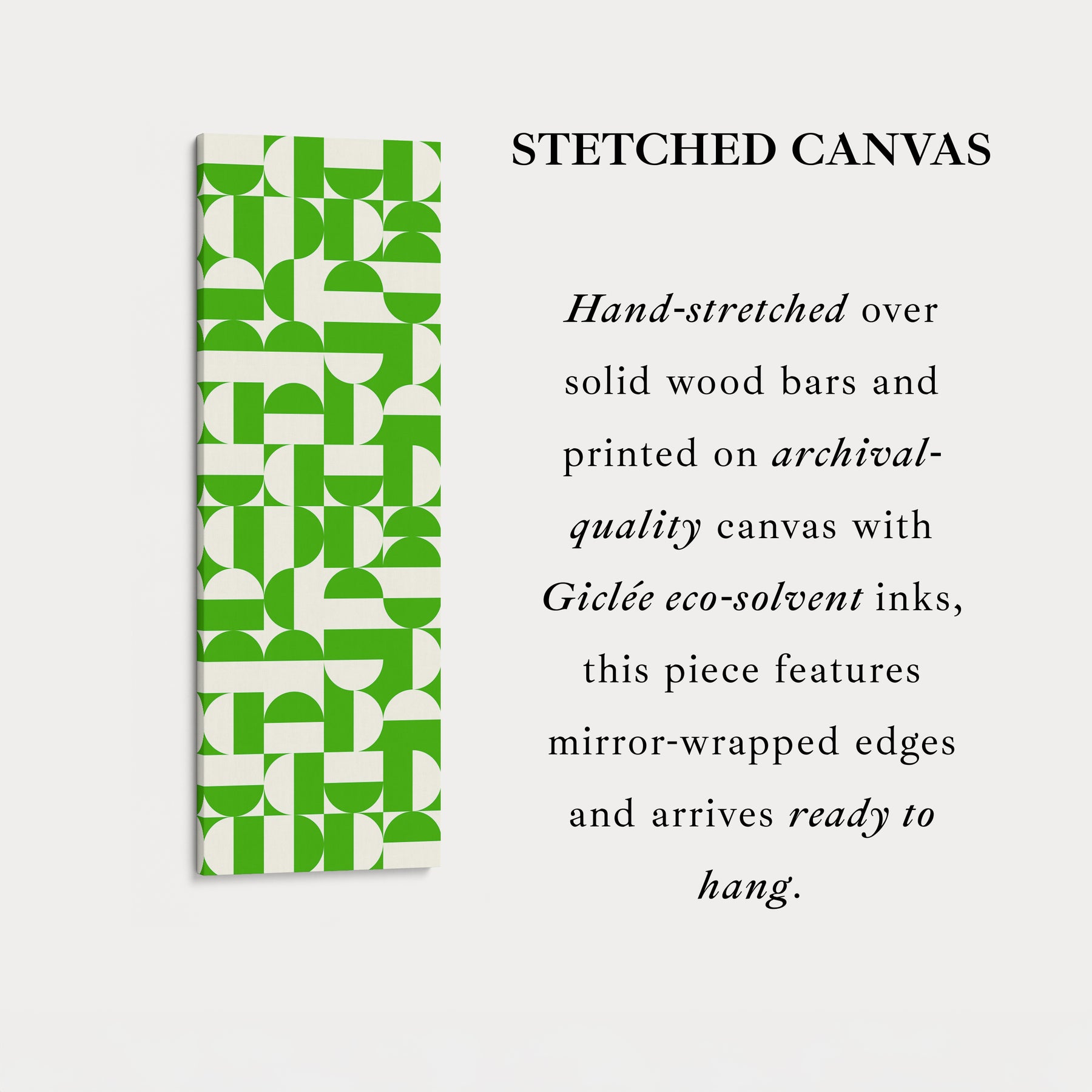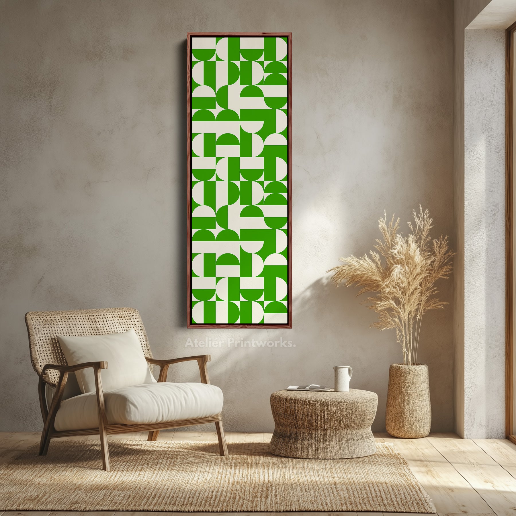 Cette toile encadrée géométrique présente une grille répétée de cercles verts et de demi-cercles sur un fond beige, formant un motif moderniste audacieux. Idéal pour les couloirs, les bureaux ou les salons, cette grande œuvre murale verticale apporte une couleur vibrante et une structure aux intérieurs.