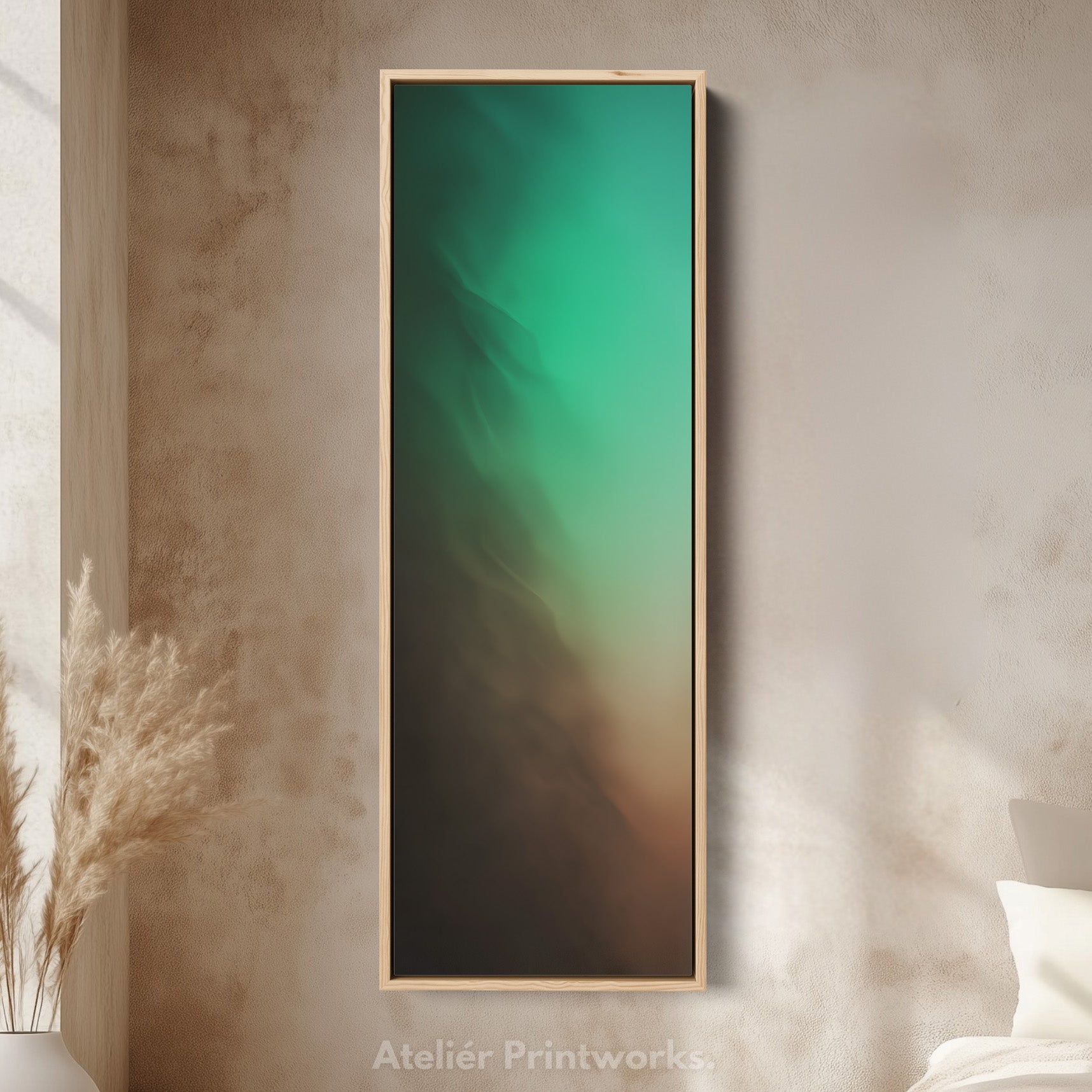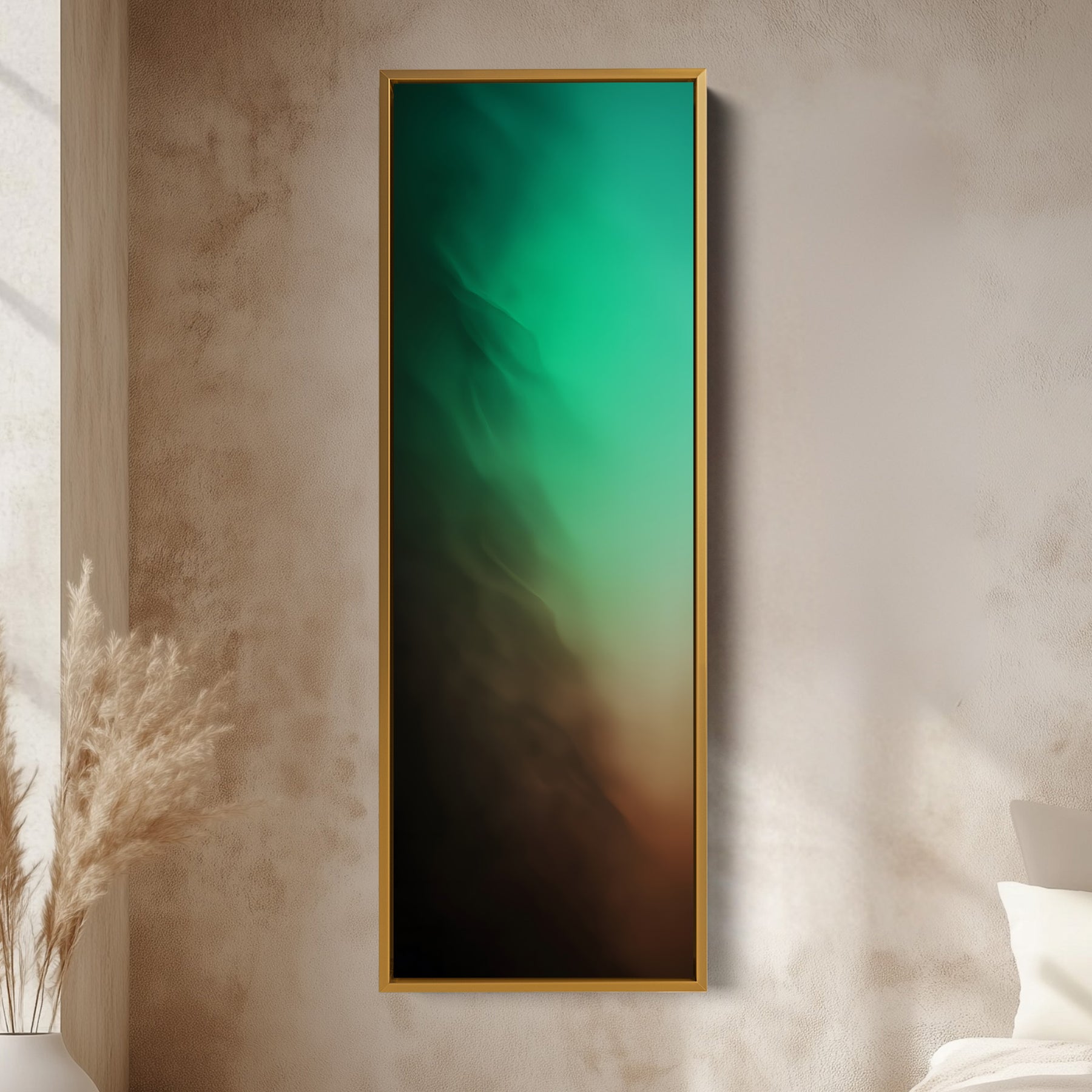 Soft green tones blend into beige creating a peaceful atmosphere. This tall wall art keeps the space feeling light and open. Its long vertical canvas shape creates visual height in narrow spaces where narrow wall art performs best. Calm tones complement neutral décor. Ideal for bedrooms or above console wall art when you want something soft and understated.