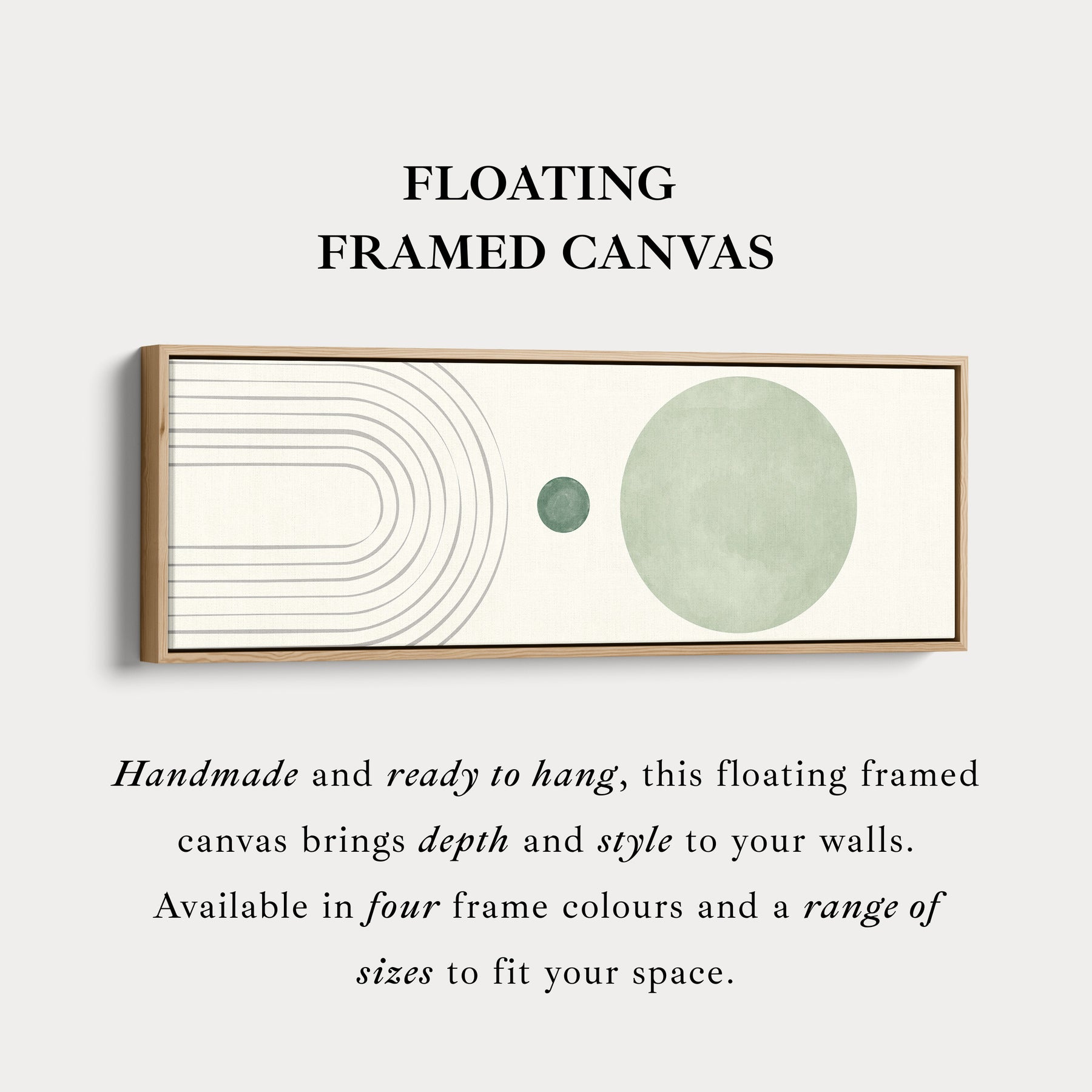 Curved linework meets soft green circles to form an elegant geometric statement with a refined feel. The light beige background keeps the palette airy and easy to style. As panoramic wall art, it fills long corridors and open plan walls without overwhelming them. The horizontal wall art orientation complements consoles and benches perfectly. Use this long canvas as above bed wall art or in a home office to introduce measured movement and modern simplicity. Great for skinny wall art placements where a clean look is key.