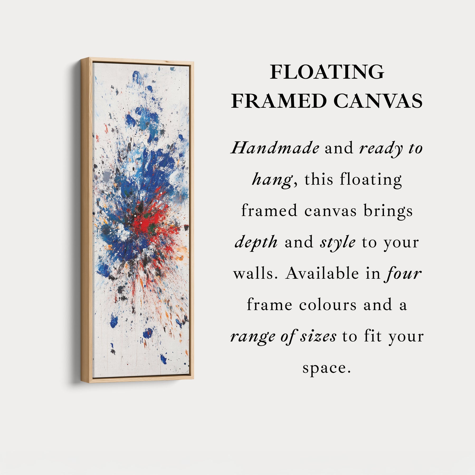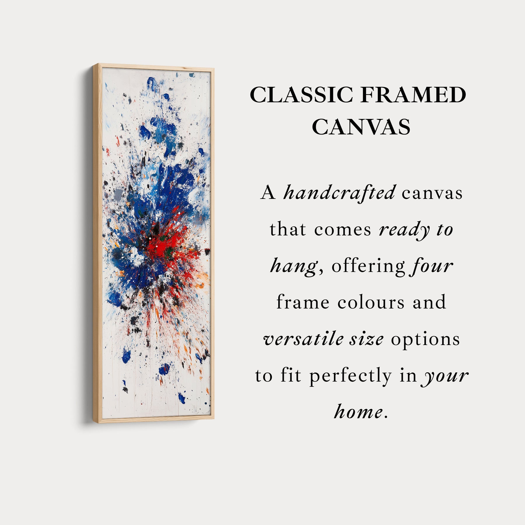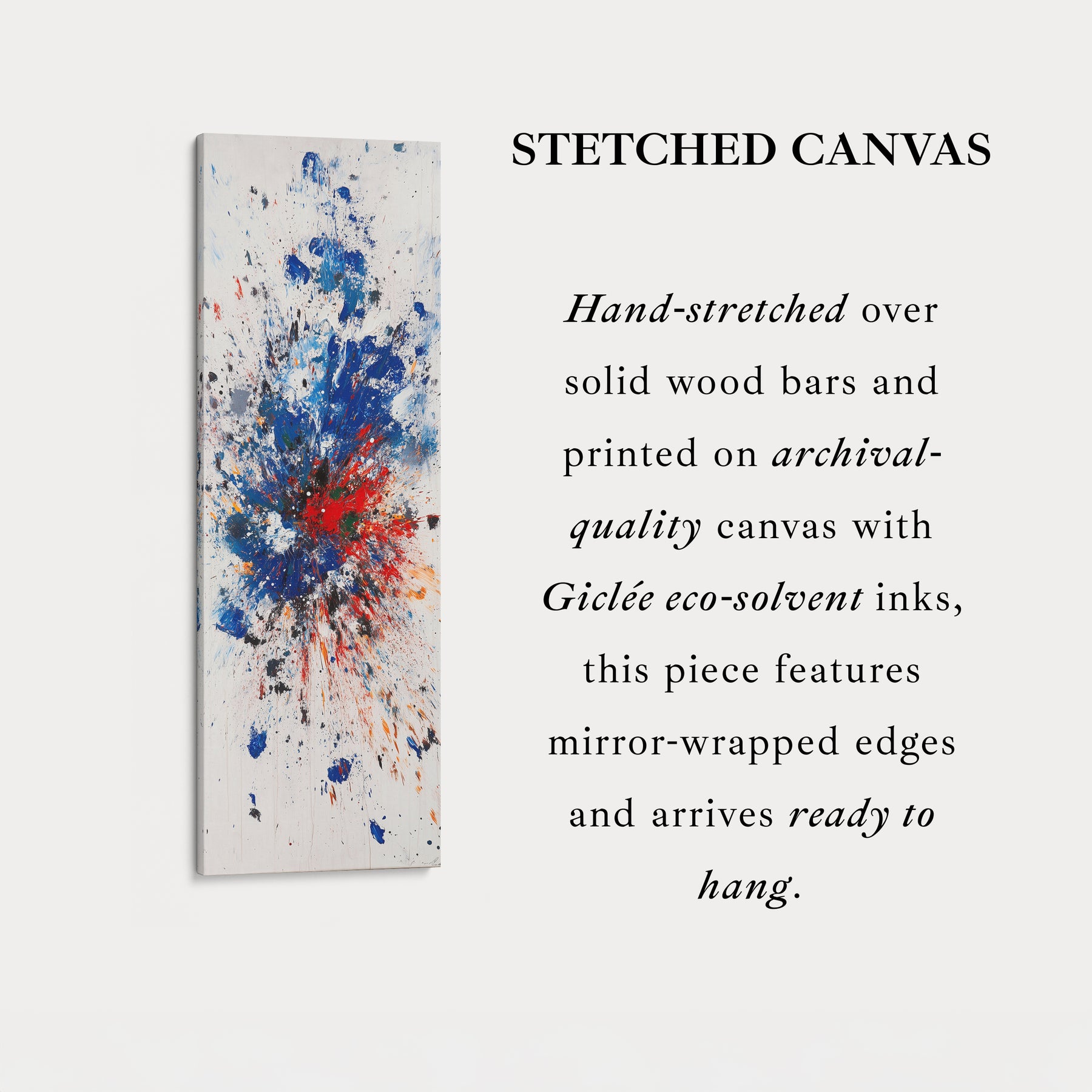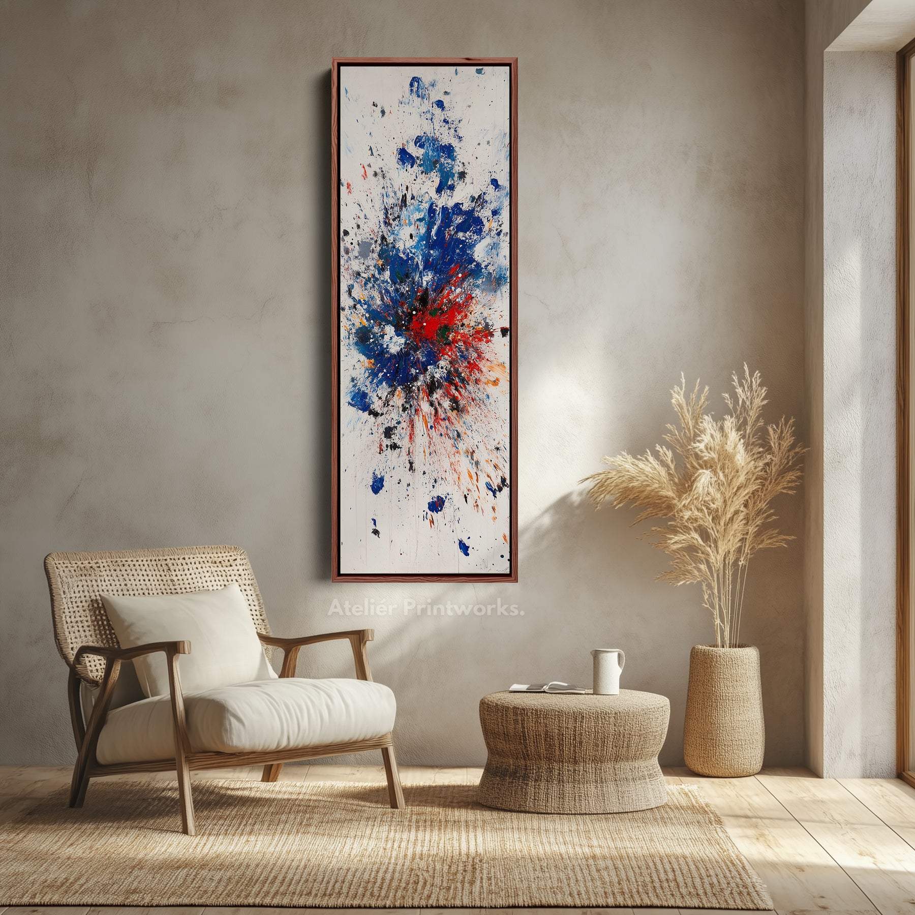 Idéal comme grande toile murale décorative, cette œuvre d'art sert de point focal saisissant pour les salons, studios ou bureaux. Son design allongé en fait un excellent choix comme art mural long pour les espaces vastes, tandis que son orientation verticale met en valeur l'explosion dynamique de couleurs.