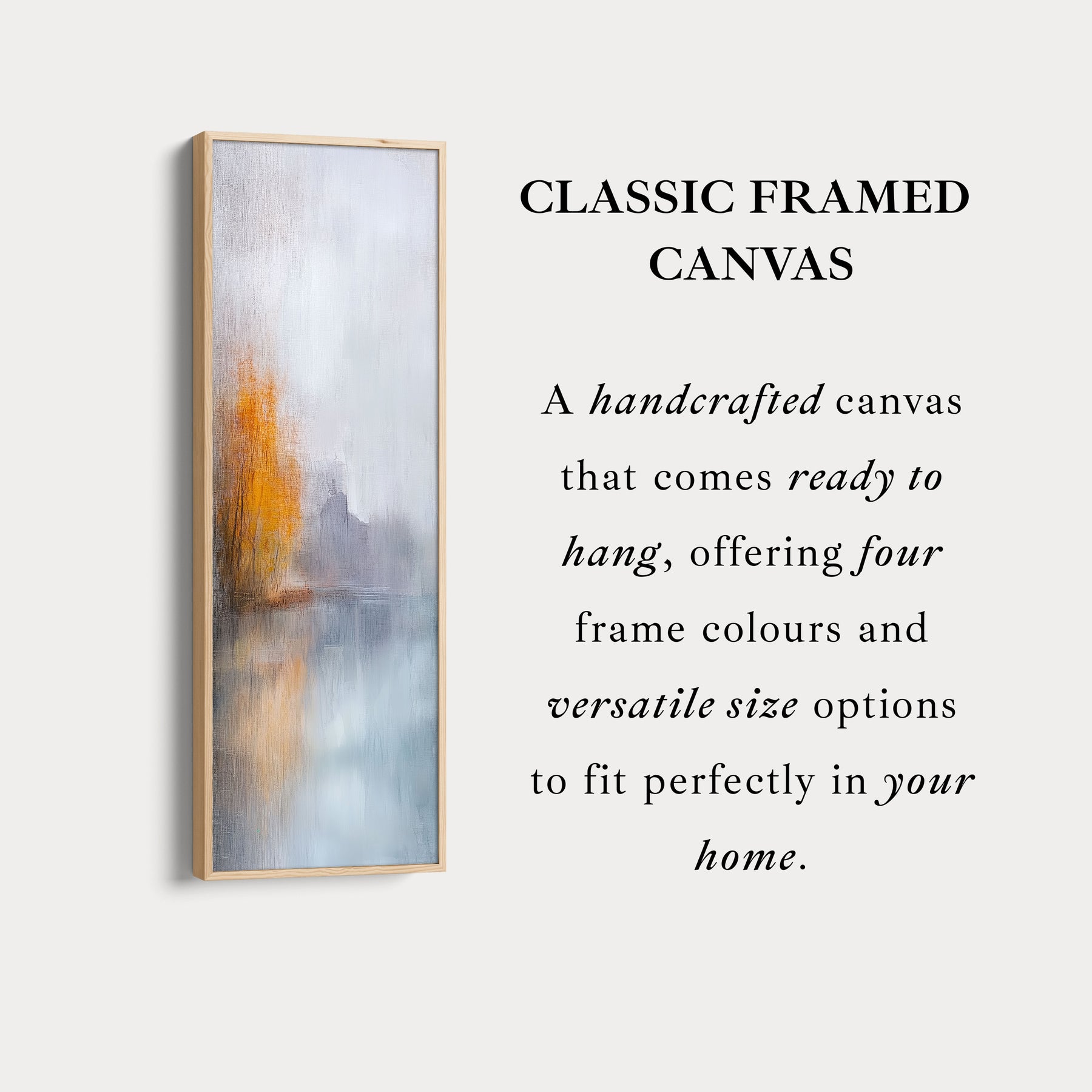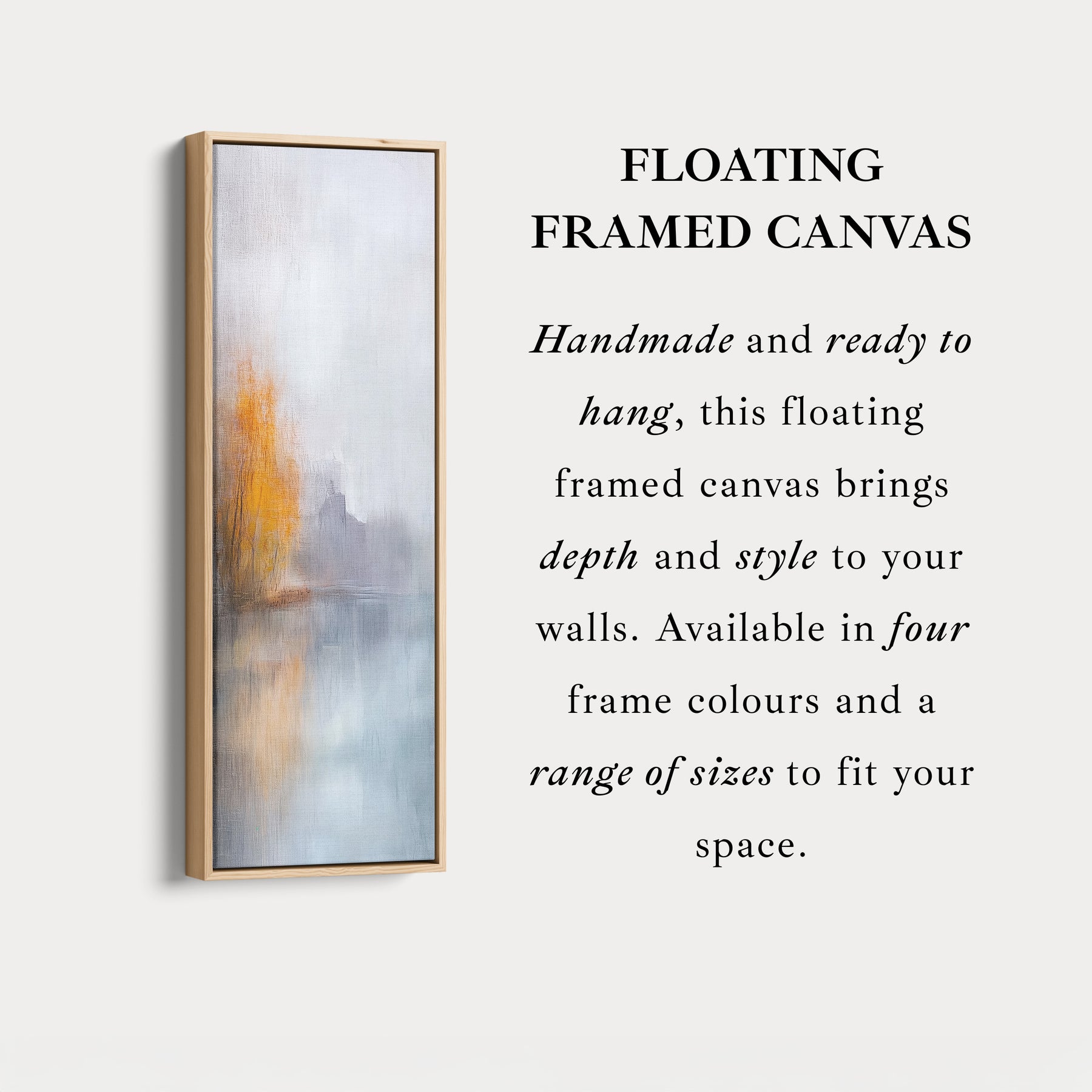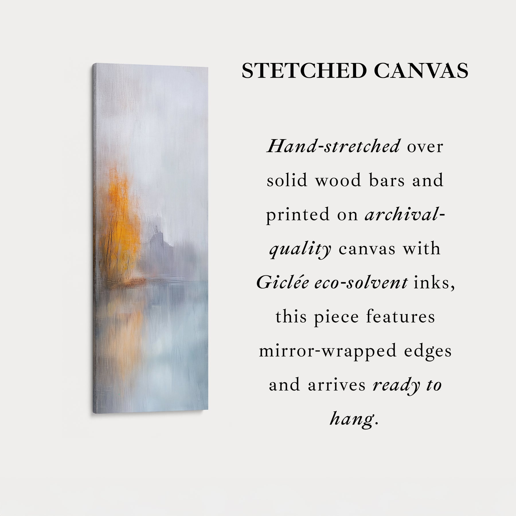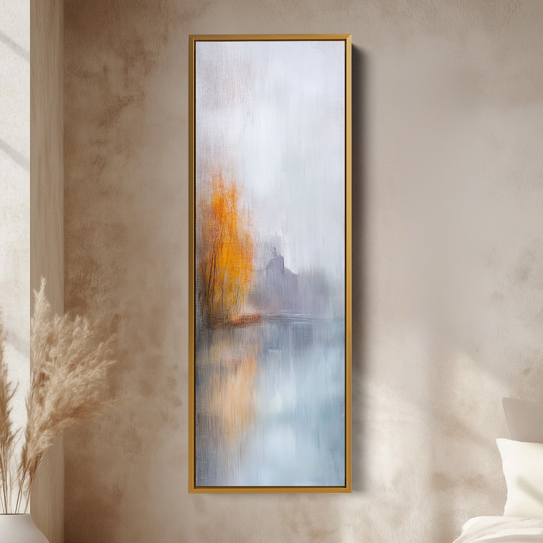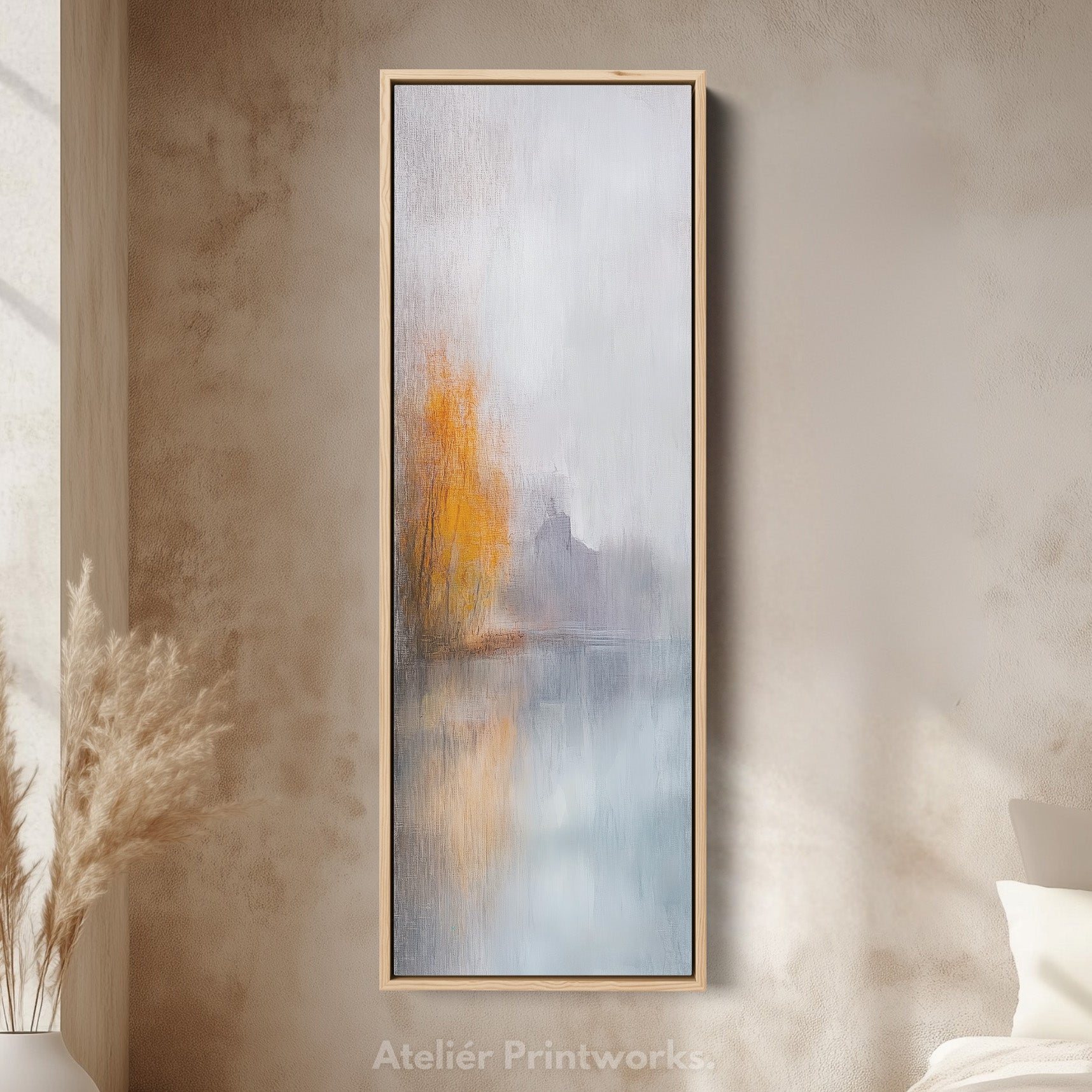 Apportez tranquillité et beauté intemporelle à votre espace avec ce tableau abstrait représentant un lac brumeux. La composition présente des touches de pinceau douces et impressionnistes qui capturent l'atmosphère éthérée d'un ciel gris reflété sur un lac serein. Des arbres jaunes vibrants le long du rivage offrent un contraste saisissant avec les tons sobres, ajoutant chaleur et énergie à la scène.