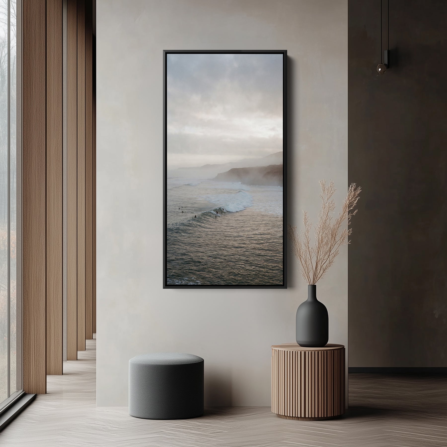 Waves roll in toward a misty coastline with cliffs in the distance. The visible colours stay within beige, grey and green. This vertical wall art suits walls that need height and balance, keeping the layout calm and proportion-led. Use it as a large vertical wall art in a hallway to add scale without taking up extra width.