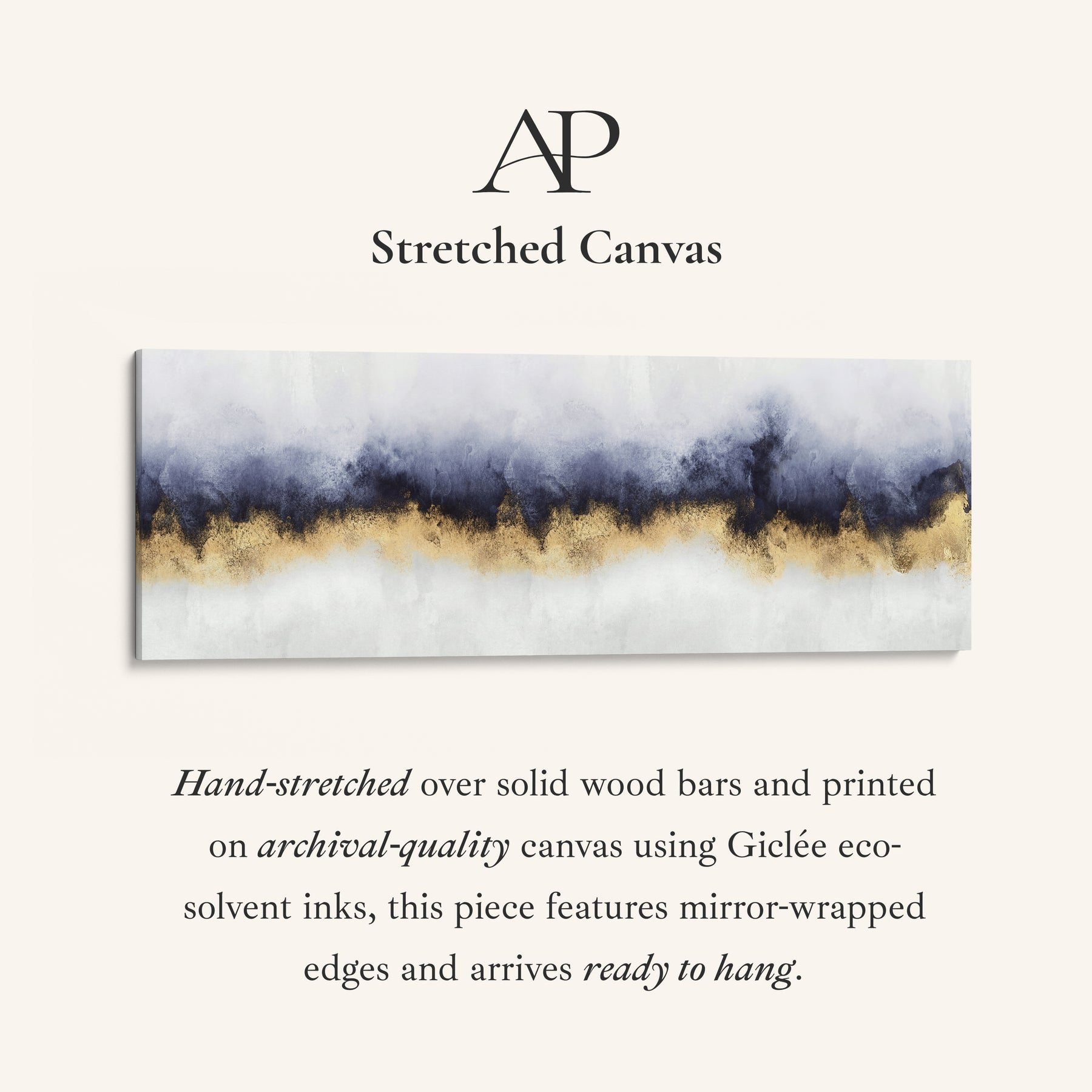 Long narrow canvas featuring a horizontal abstract horizon with deep blue above layered beige and white areas. The colour bands stretch seamlessly across the width. Blue contrasts with soft beige and white, forming a minimal layered composition. The central band creates a visual divide across the wide canvas. As horizontal wall art for a bedroom, this panoramic wall art offers calm balance. Its elongated shape makes it suitable as above bed wall art without dominating the room.