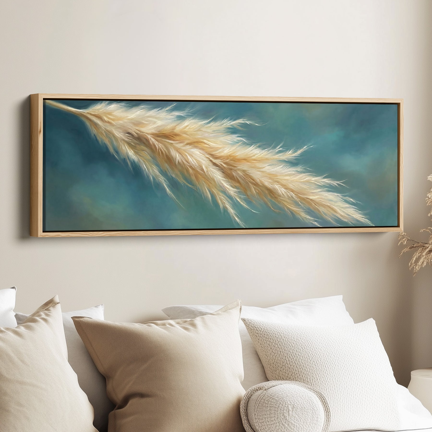 Beige pampas grass stretches horizontally across a blue and teal background. The feathery strands extend lightly across the frame. Beige and brown tones in the grass contrast with the cool blue backdrop, creating a balanced natural composition. The elongated format emphasises the flowing lines. This large wall art piece suits a hallway, delivering panoramic wall art scale that adds subtle movement across a wide space.