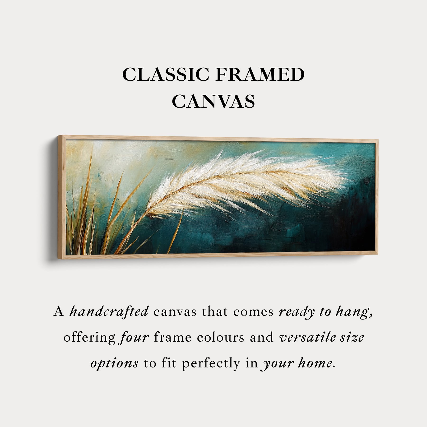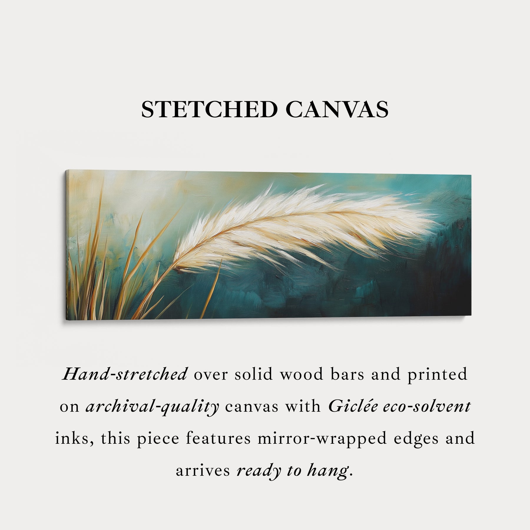 Deze horizontale wanddecoratie toont een elegante olieverfschildering van lang gras dat zachtjes in de wind wiegt. Het palet bevat zachte tinten lichtteal en beige, contrasterend met een donkere achtergrond die de diepte en sfeer van het kunstwerk versterkt.