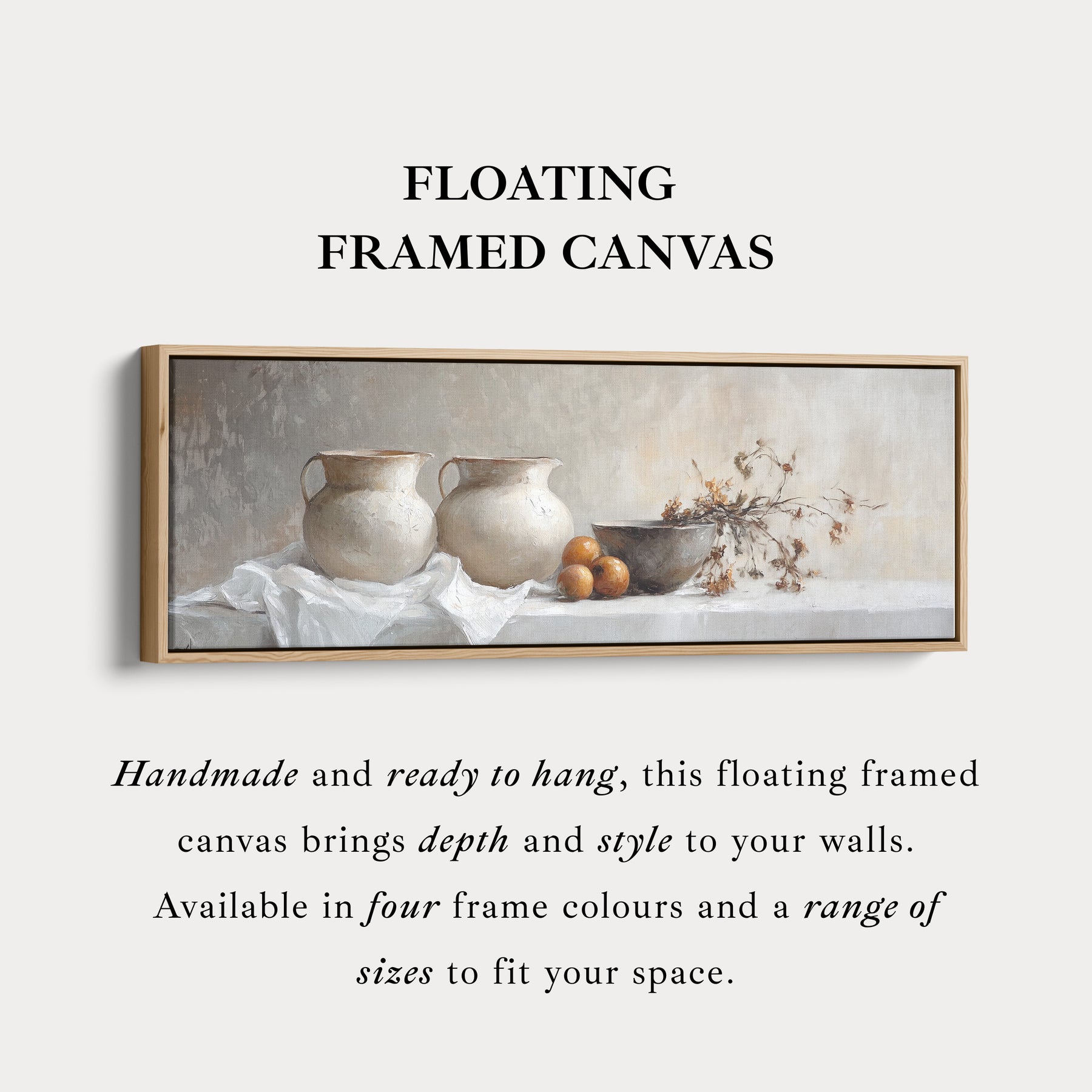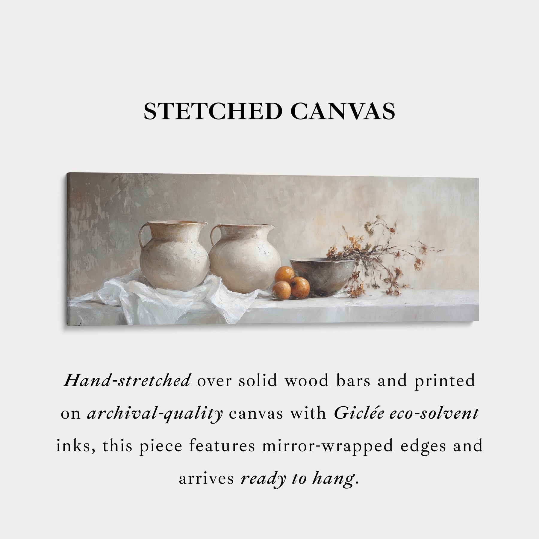 Dit prachtige olieverfschilderij toont een serene stillevencompositie van twee kannen en een kom die rusten op een wit tafelkleed, geaccentueerd door gedroogde bloemen en kleine sinaasappels op de achtergrond. Tegen een witte muur heeft het kunstwerk een beige kleurenpalet met neutrale tinten en zacht licht, wat een kalme en vintage esthetiek oproept. De subtiele witte linnen papiertextuur voegt diepte en karakter toe, waardoor het een tijdloos en elegant middelpunt wordt.