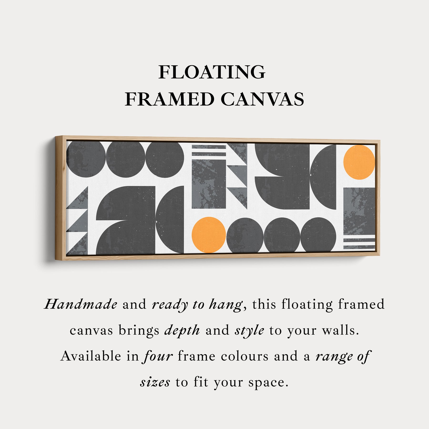 Large circular and semi-circular grey forms are punctuated by bright orange circles, giving a contemporary contrast across the long canvas. The layout brings strong visual balance and architectural feel. Ideal for dining rooms, hallways, or modern minimal spaces.