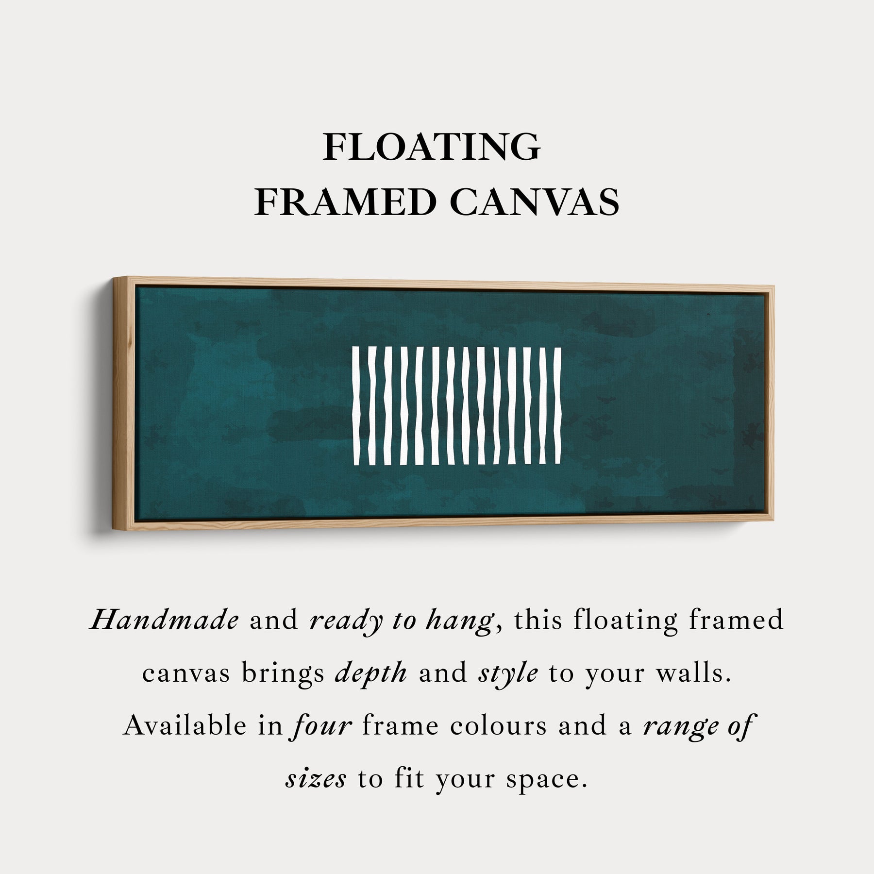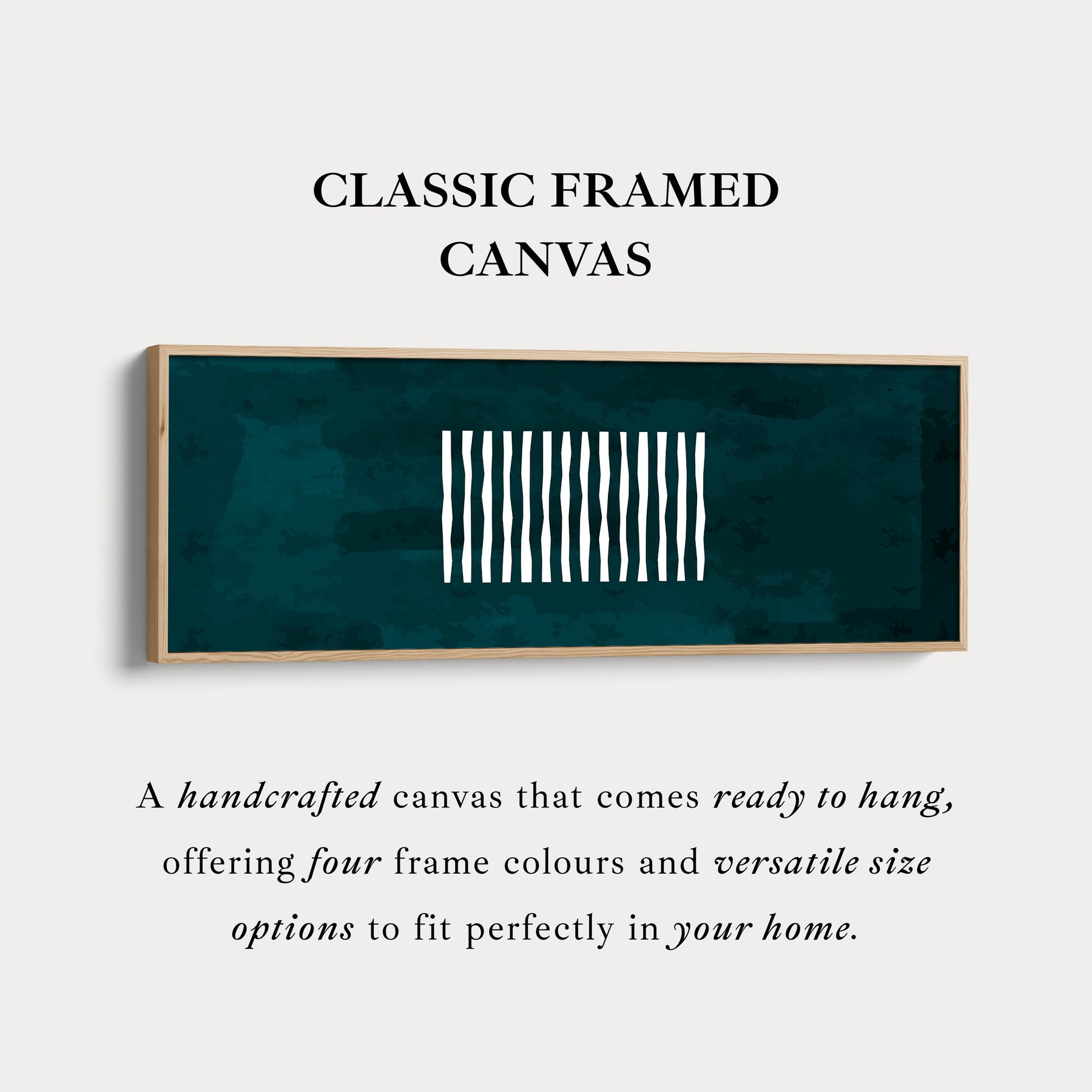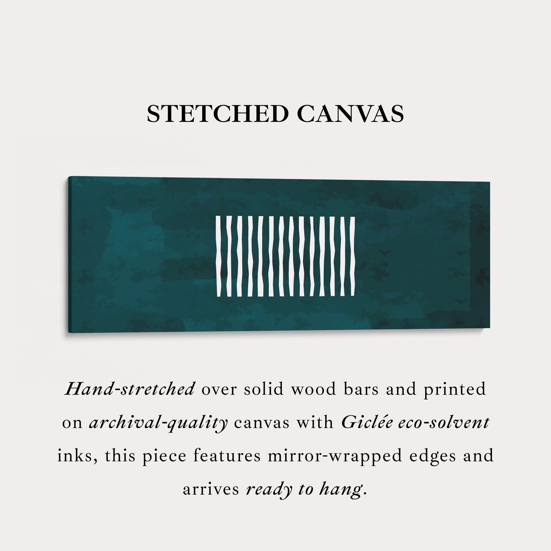 A bold long canvas featuring uneven vertical white lines on a deep green background. The minimalist composition gives crisp contrast while still feeling organic. This panoramic wall art works well as above bed wall art or as a striking feature in a hallway or office. Its structured simplicity helps elongate the wall visually. Ideal for interiors that need skinny wall art that is modern refined and clean.