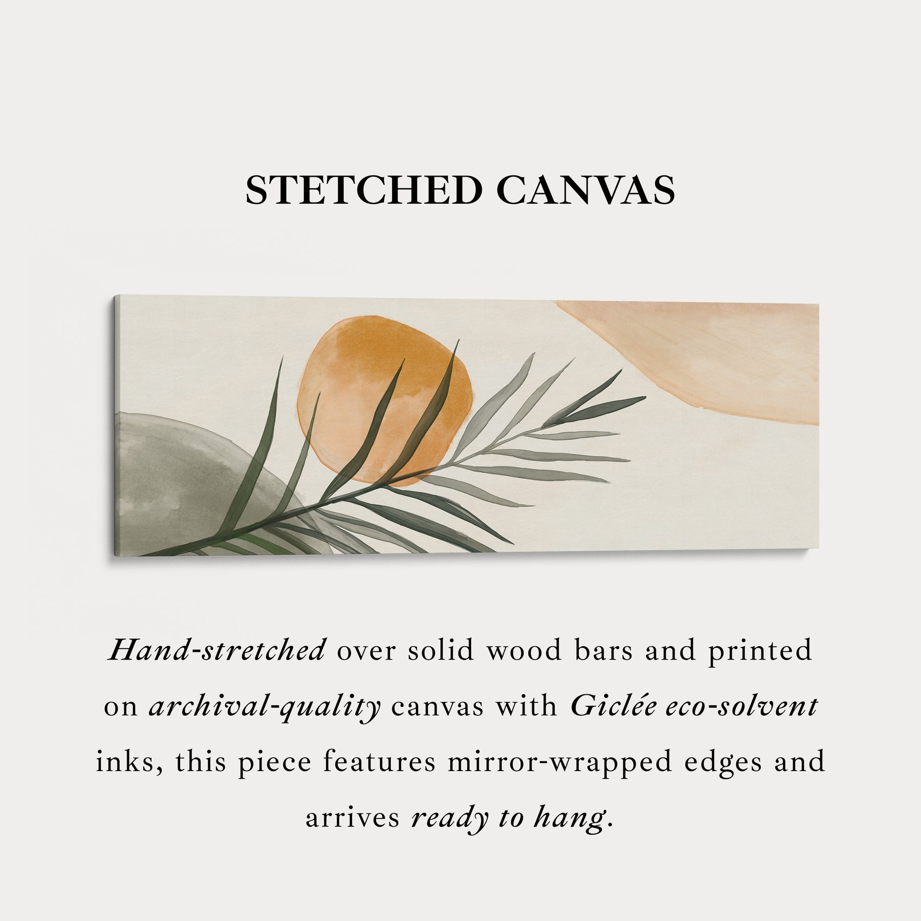 Verfraai uw ruimte met deze abstracte botanische illustratie met gedempte beige en groene tinten. Het ontwerp benadrukt een enkel palmblad weergegeven in eenvoudige, minimalistische vormen, wat een harmonieuze en moderne compositie creëert. Het gedempte kleurenpalet roept een gevoel van kalmte op, waardoor het een perfecte aanvulling is op hedendaagse of minimalistische interieurs.