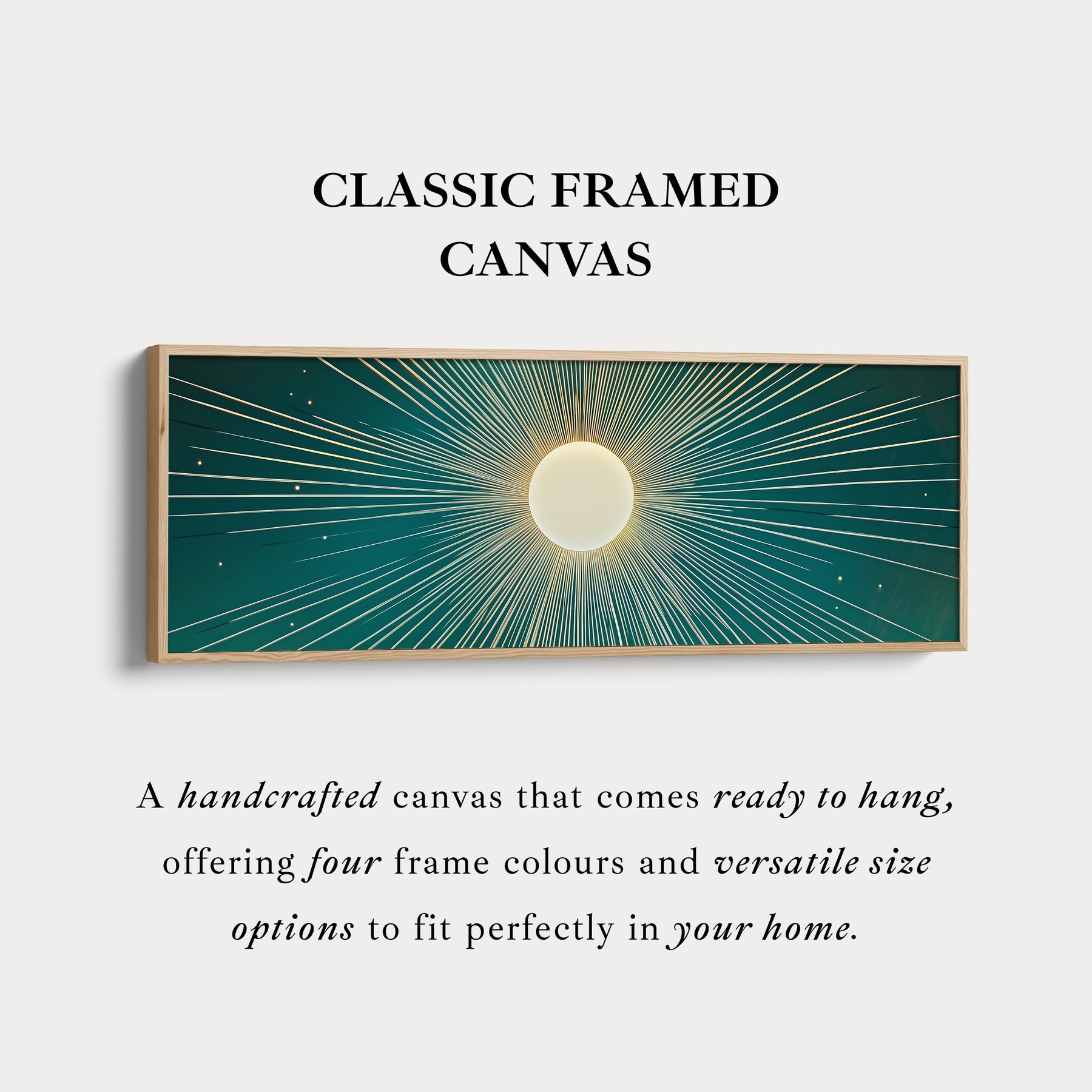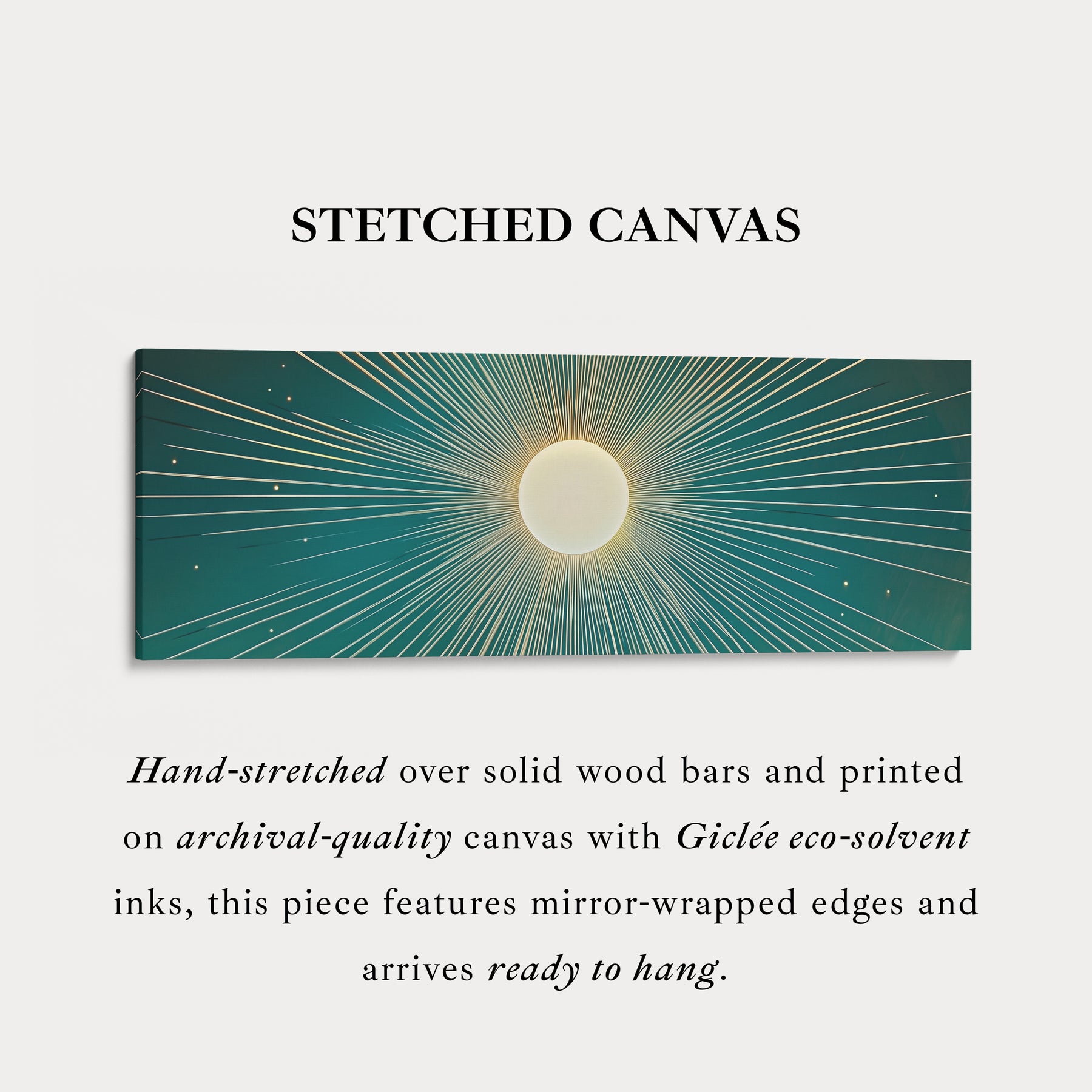 This horizontal wall art features a white sun with delicate rays, perfectly centered on an emerald green background. Thin lines at the top and bottom frame the design, creating a sense of balance and refinement. The panoramic format adds depth and elegance, making it an ideal choice for decorating above a sofa, bed, or long hallway wall.