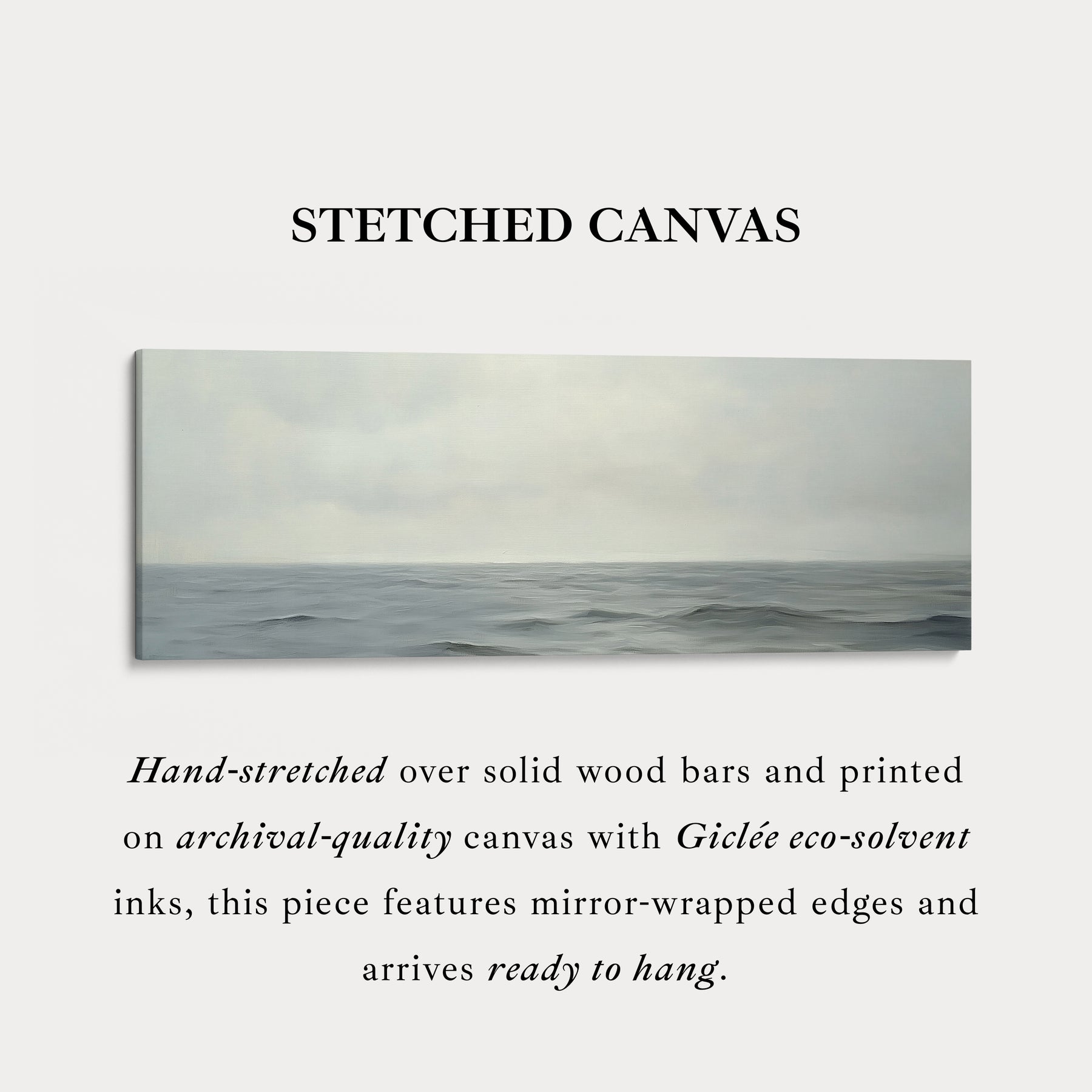 Dit olieverfschilderij van de oceaan toont een vlakke horizonlijn, een grijze lucht en grijs water, uitgevoerd in een minimalistische stijl. De gedempte tinten en eenvoudige compositie roepen een gevoel van kalmte en tijdloosheid op, waardoor het een veelzijdig stuk is voor verschillende interieurstijlen.