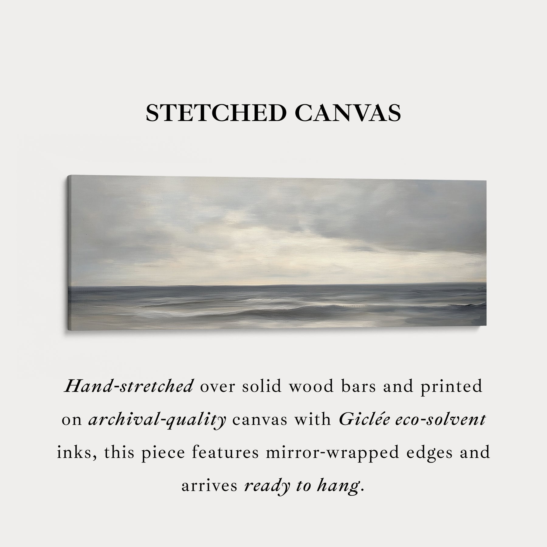 Deze olieverfschilderijafdruk van de oceaan toont een vlakke horizonlijn, een grijze lucht en grijs water, uitgevoerd in een minimalistische stijl. De gedempte tinten en eenvoudige compositie roepen een gevoel van kalmte en tijdloosheid op, waardoor het een veelzijdig stuk is voor verschillende interieurstijlen.