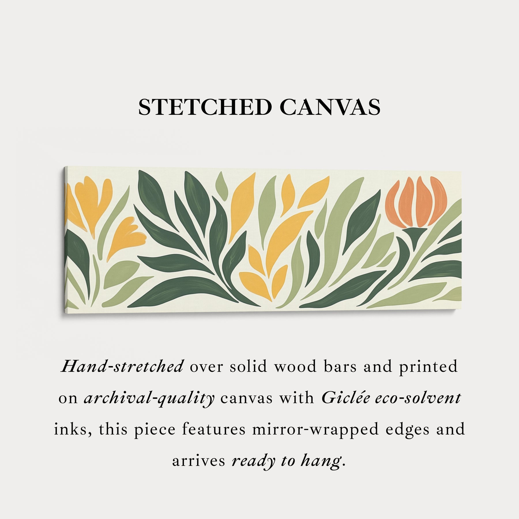Perfect voor horizontale lange wandkunst, brengt dit stuk een natuurlijke en rustgevende toets aan brede ruimtes, zoals woonkamers of eetgedeeltes. Als grote smalle canvas wandkunst maakt het langgerekte formaat het ideaal voor gangen, entrees of boven meubels. De combinatie van gedempte groentinten en warme oranje tinten tegen de crèmekleurige achtergrond geeft dit kunstwerk een vintage-geïnspireerde charme, waardoor het een veelzijdige en stijlvolle toevoeging aan elk interieur is.