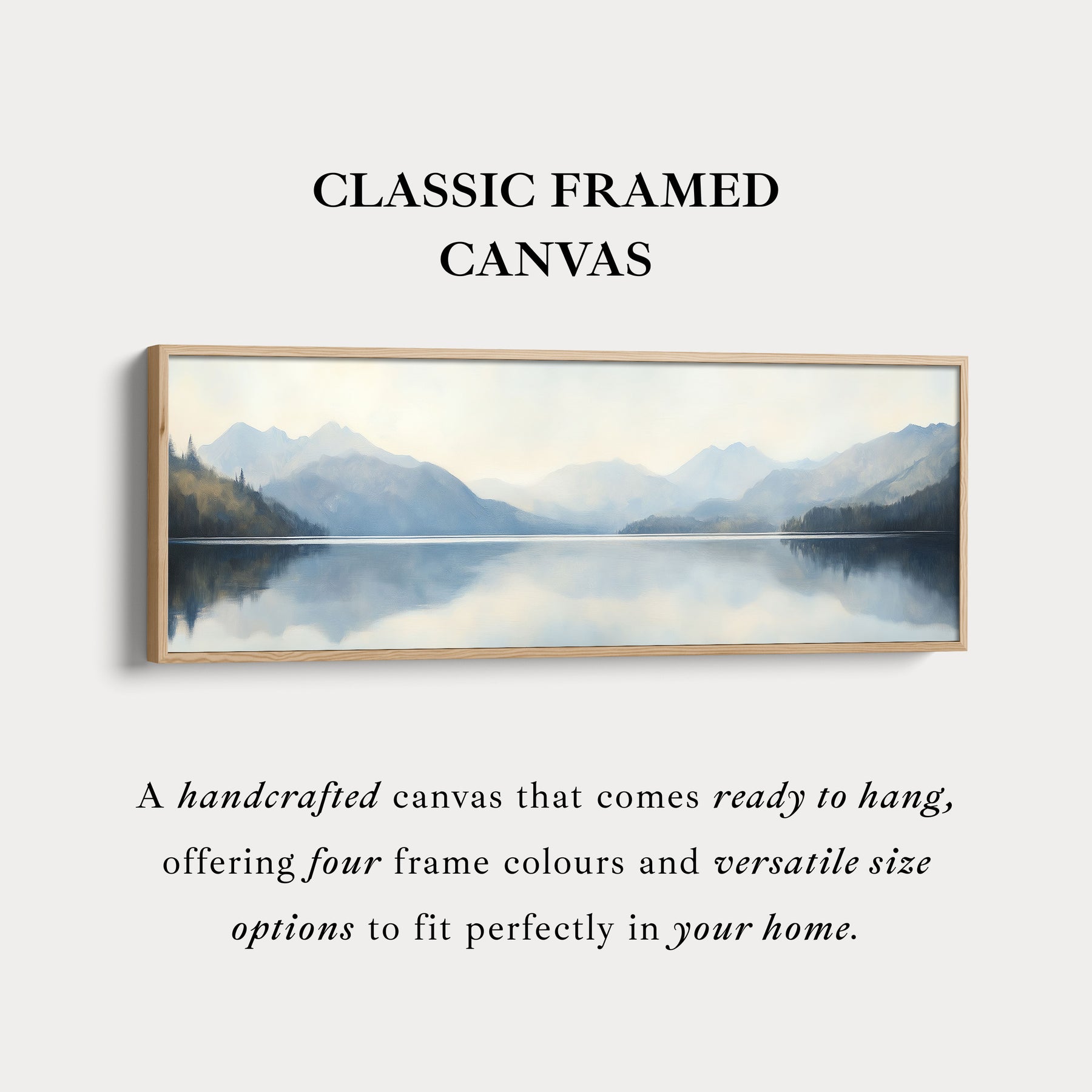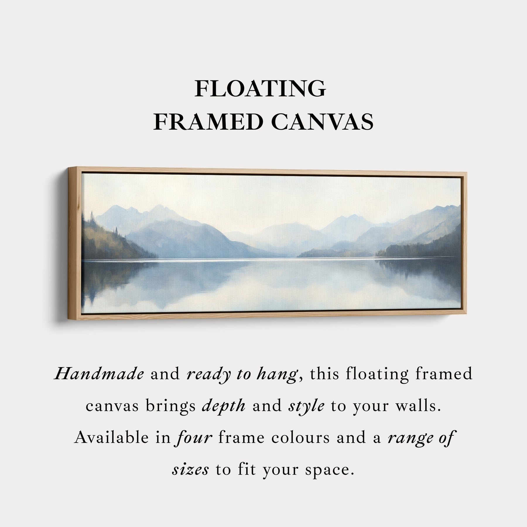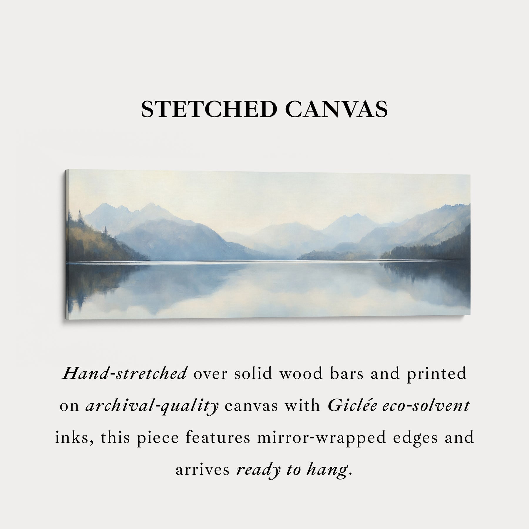 Dit abstracte schilderij vangt de serene schoonheid van bergen met een rustig meer op de voorgrond, waarbij de zachte reflectie op het water onder mistig ochtendlicht wordt getoond. Uitgevoerd in gedempte kleuren, creëert de compositie een kalmerend effect, waardoor het een perfecte keuze is om een gevoel van vrede en elegantie aan uw ruimte toe te voegen.