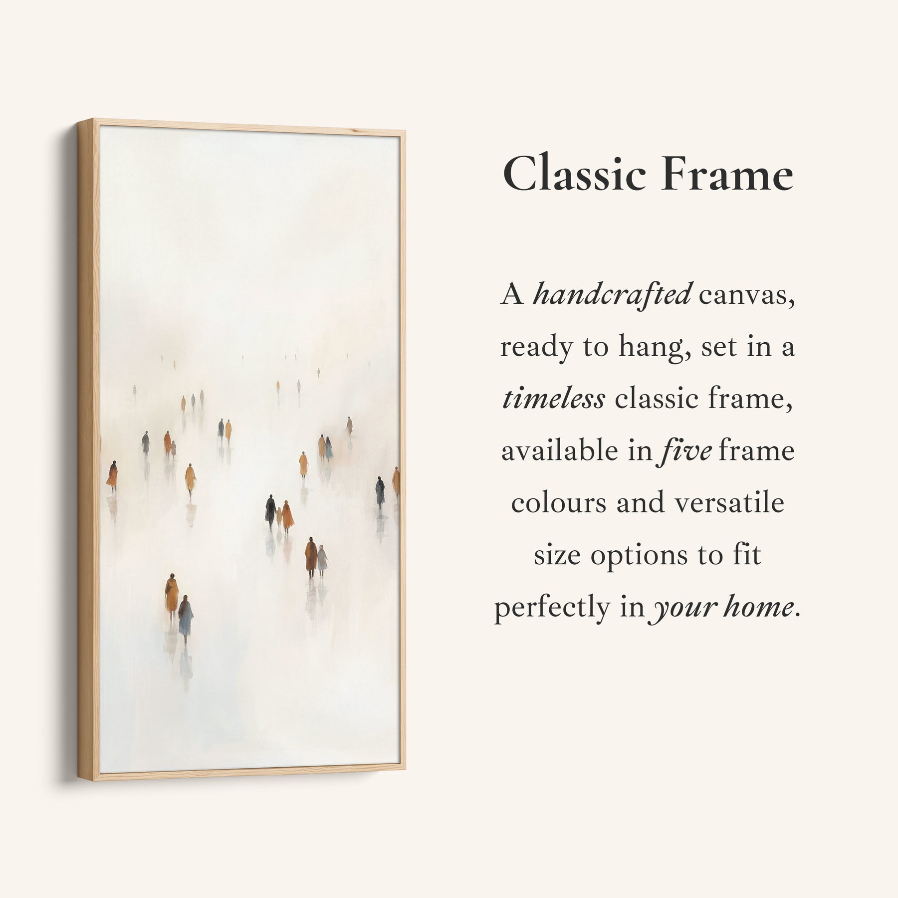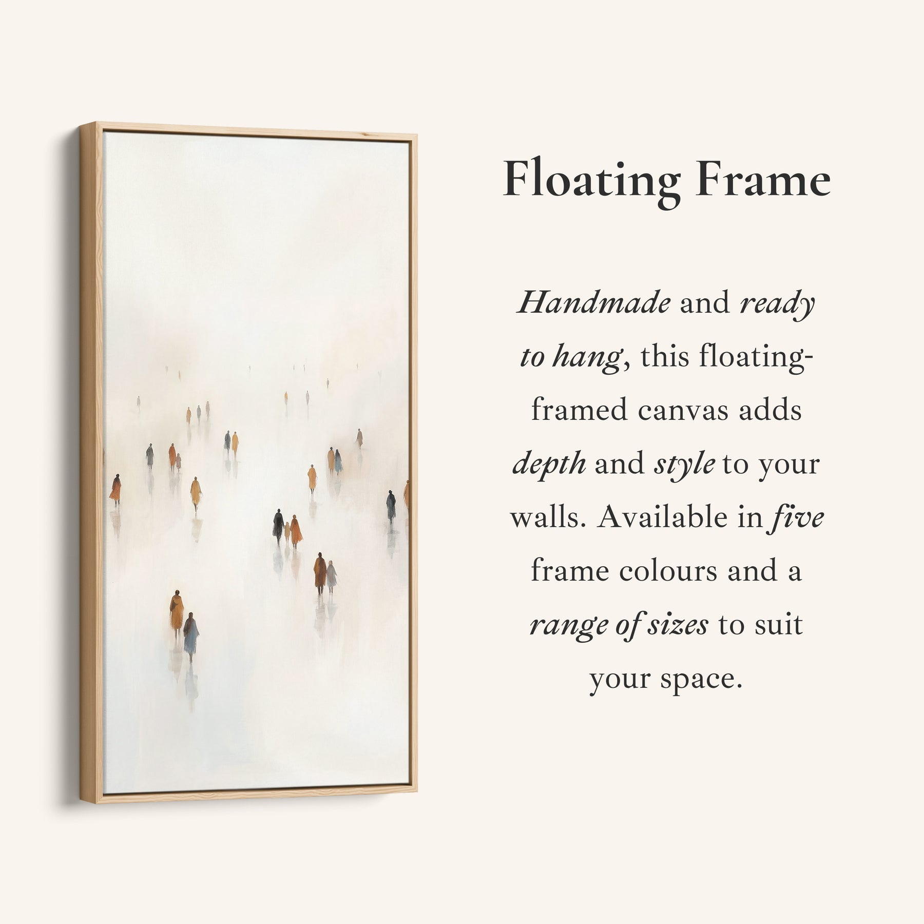 Small figures walk through a pale foggy landscape with faint reflections below. The visible colours stay within white and beige. This tall wall art suits walls that need height and balance, keeping the layout calm and proportion-led. Use it as a tall canvas in a office to add scale without taking up extra width.