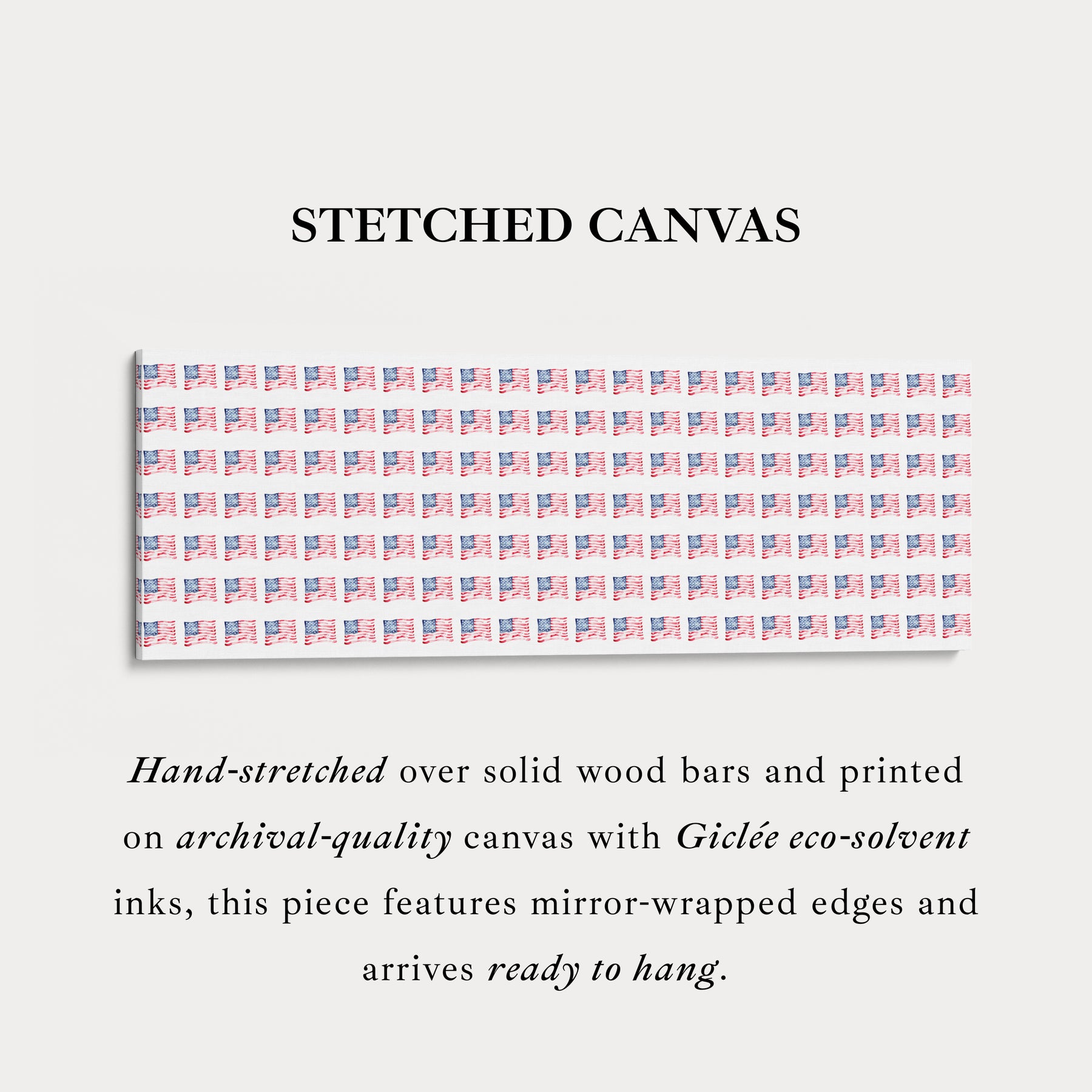 Ideaal voor horizontale wanddecoratie, brengt dit patroon een patriottische en feestelijke toets aan brede ruimtes zoals kantoren, woonkamers of themaruimtes voor evenementen. Als groot panoramisch canvas dient het als een opvallend middelpunt, dat naadloos opgaat in moderne, minimalistische of door Americana geïnspireerde interieurs. De gestructureerde maar dynamische rangschikking van vlaggen maakt dit kunstwerk tot een tijdloze en veelzijdige toevoeging aan elke ruimte die het Amerikaanse erfgoed viert.