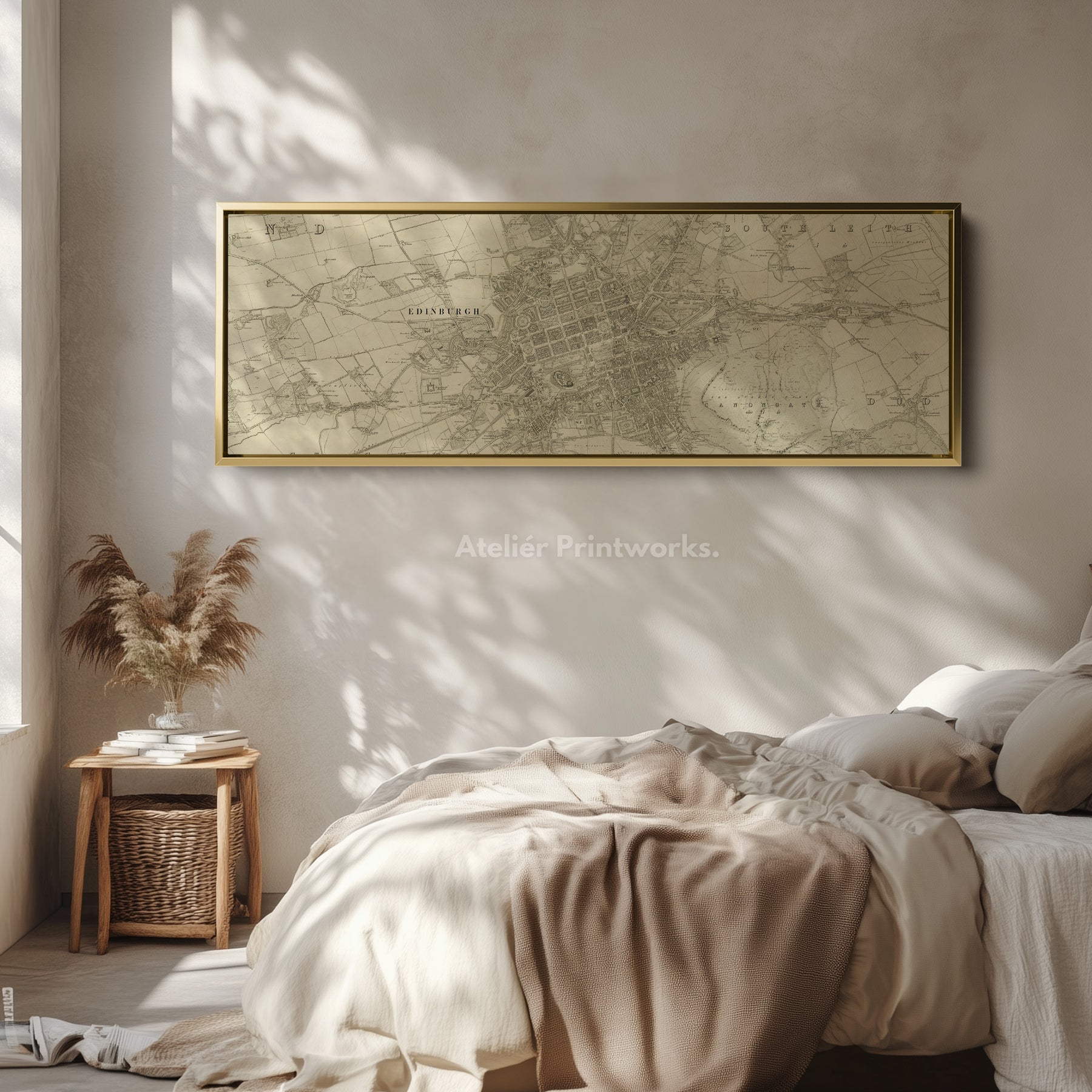 This 1853 Edinburgh map captures the city in extraordinary detail, from the structured grid of the New Town to the rugged forms of Calton Hill and the surrounding rural landscape. The long canvas layout highlights the historic spread of the city, turning the artwork into panoramic wall art with a strong sense of place. Soft beige and black tones give it a timeless character that works well in both light and darker interiors. Its horizontal wall art format fits especially well in hallways, bedrooms, or above bed wall art where a slim, wide piece balances the wall. Printed as a framed canvas, this design brings together elegant cartography and classic décor styling. Use it wherever you want a sophisticated touch that feels both historic and versatile, from living rooms to home offices.