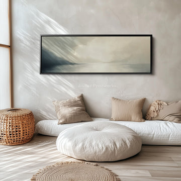 This abstract illustration captures the serene beauty of a misty lake with distant mountains, rendered in soft gray and white tones. The minimalist design features simple shapes and smooth lines, creating a foggy, calm mood that adds a sense of tranquility to any space.