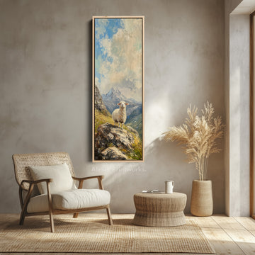 This tall slim wall art features a moody and atmospheric oil painting of a fluffy white sheep standing proudly in the Scottish Highlands. The serene composition showcases rugged mountains in the background, adding depth and drama to the piece. The detailed brushwork captures the sheep’s soft, textured wool and the Highland’s raw beauty, creating a timeless and elegant addition to your décor.