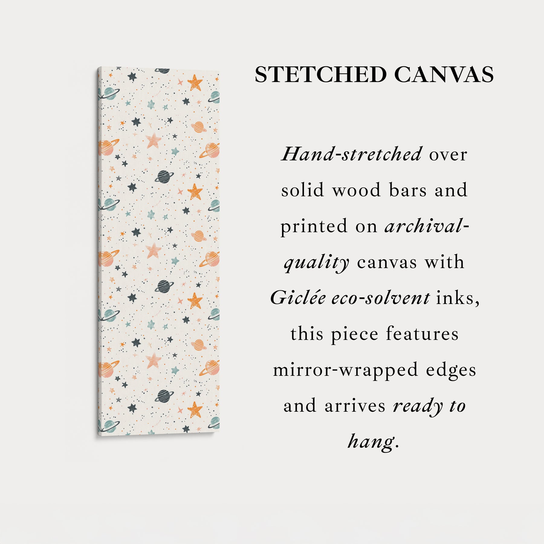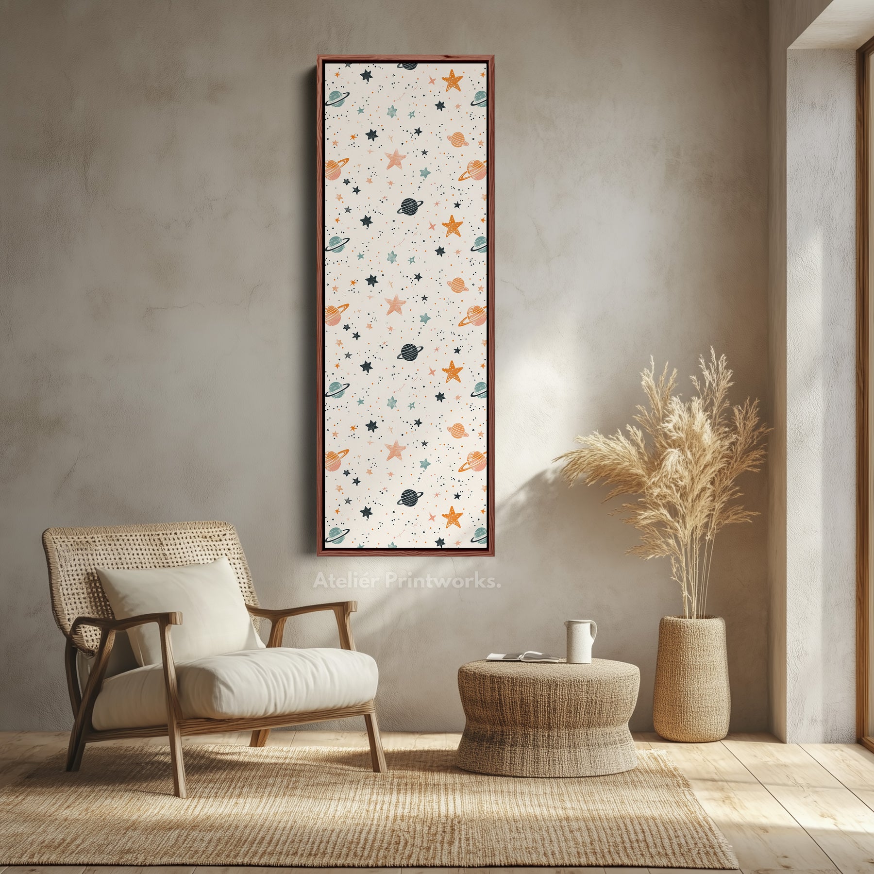 Ideal for vertical wall art, this pattern brings a gentle cosmic touch to tall spaces such as nursery accent walls, playrooms, or bedside areas in children's bedrooms. As a large vertical canvas, it serves as a delightful focal point, filling the room with warmth and imagination. The combination of pastel hues and celestial elements makes this artwork a charming and versatile addition to any nursery or space-themed interior.